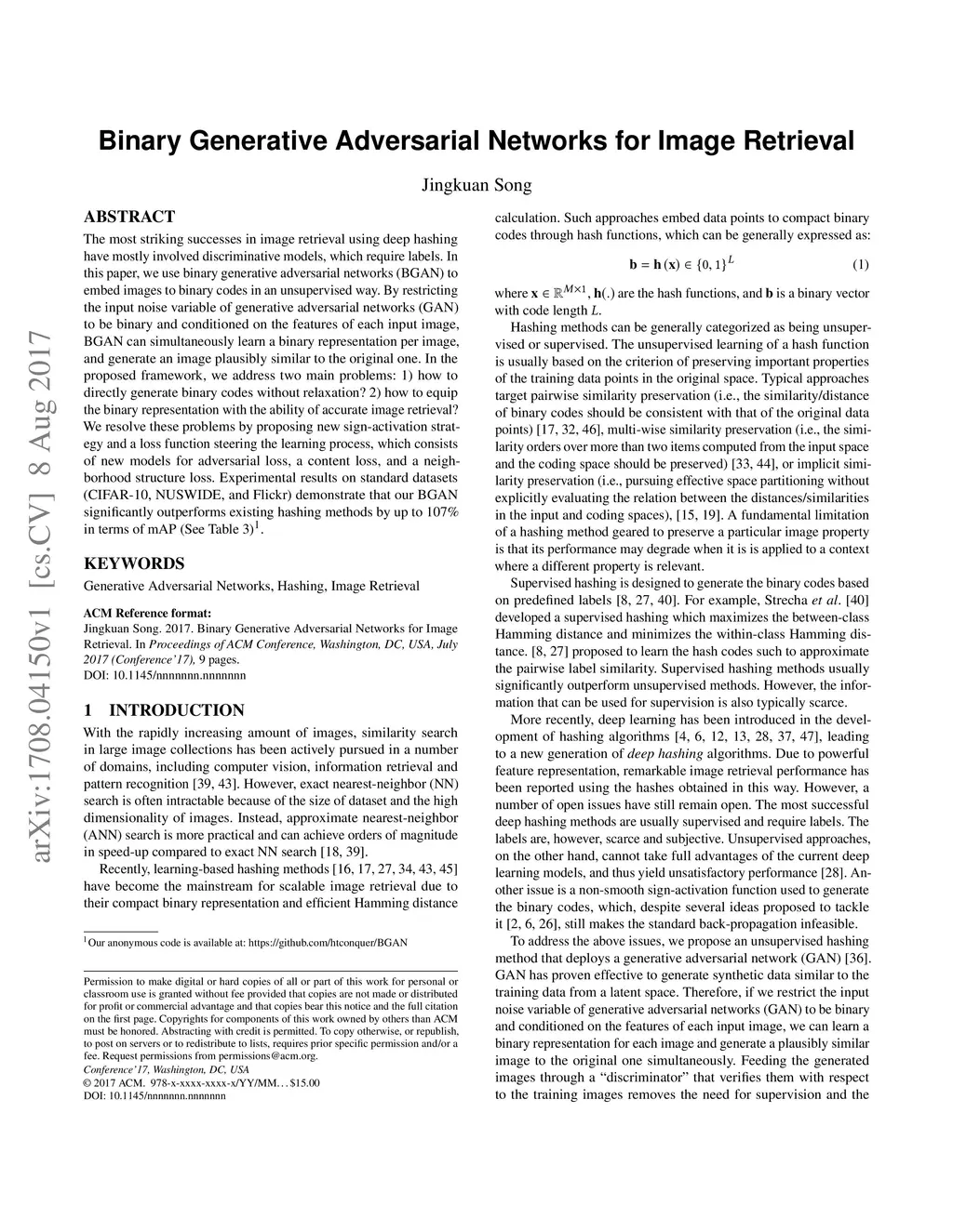 The most striking successes in image retrieval using deep hashing have mostly involved discriminative models, which require labels. In this paper, we use binary generative adversarial networks (BGAN) to embed images to binary codes in an unsupervised way. By restricting the input noise variable of generative adversarial networks (GAN) to be binary and conditioned on the features of each input image, BGAN can simultaneously learn a binary representation per image, and generate an image plausibly similar to the original one. In the proposed framework, we address two main problems: 1) how to directly generate binary codes without relaxation? 2) how to equip the binary representation with the ability of accurate image retrieval? We resolve these problems by proposing new sign-activation strategy and a loss function steering the learning process, which consists of new models for adversarial loss, a content loss, and a neighborhood structure loss. Experimental results on standard datasets (CIFAR-10, NUSWIDE, and Flickr) demonstrate that our BGAN significantly outperforms existing hashing methods by up to 107\% in terms of~mAP (See Table tab.res.map.comp) Our anonymous code is available at: https://github.com/htconquer/BGAN.