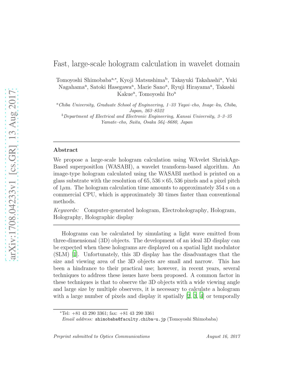 We propose a large-scale hologram calculation using WAvelet ShrinkAge-Based superpositIon (WASABI), a wavelet transform-based algorithm. An image-type hologram calculated using the WASABI method is printed on a glass substrate with the resolution of pixels and a pixel pitch of m. The hologram calculation time amounts to approximately 354 s on a commercial CPU, which is approximately 30 times faster than conventional methods.