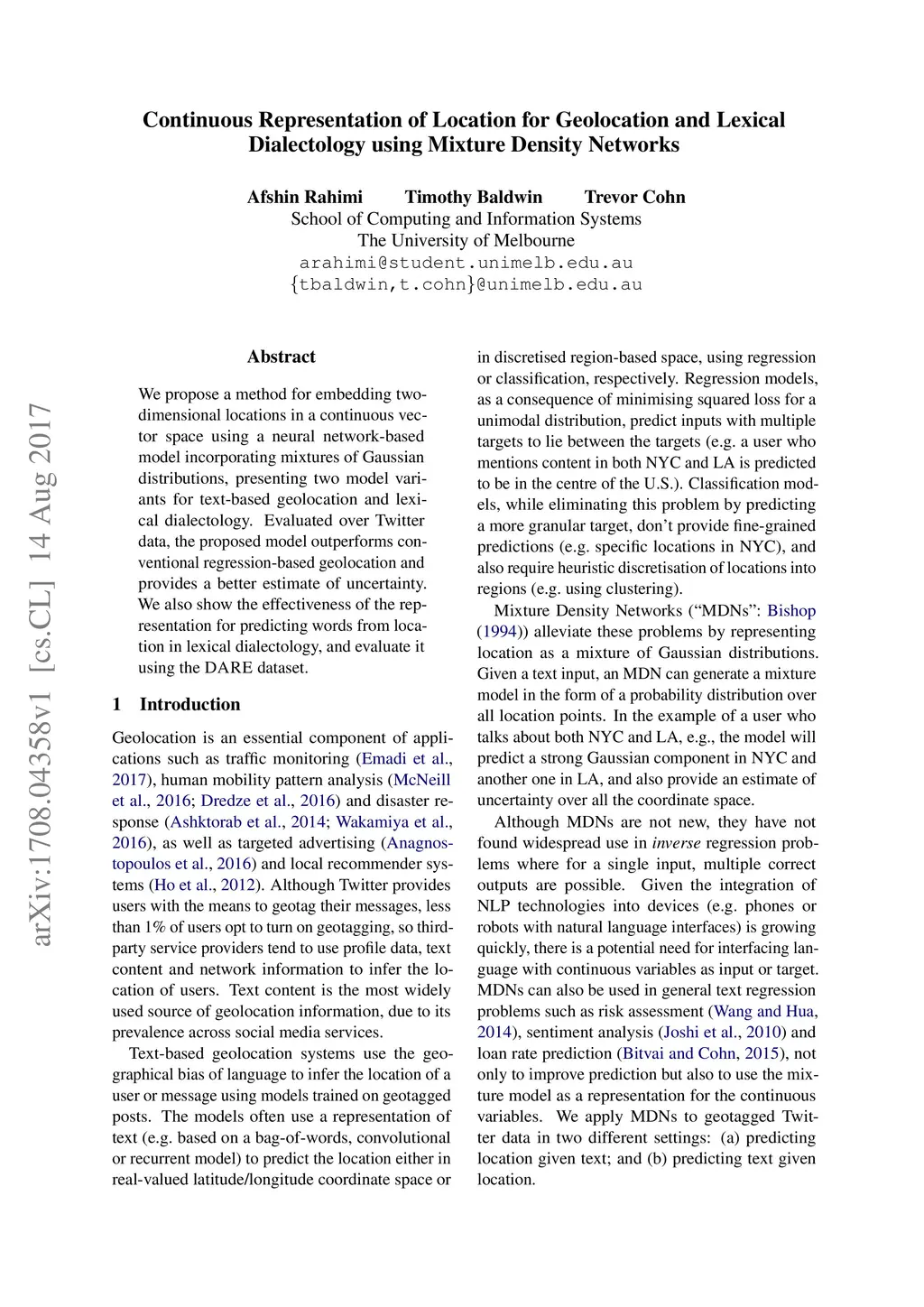 Continuous Representation of Location for Geolocation and Lexical