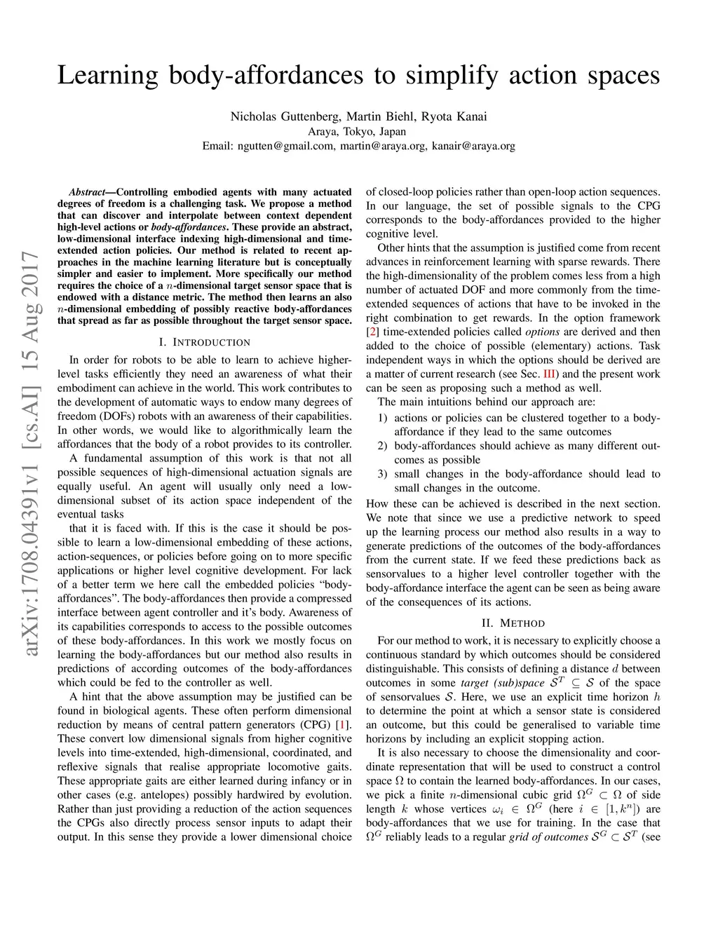 Controlling embodied agents with many actuated degrees of freedom is a challenging task. We propose a method that can discover and interpolate between context dependent high-level actions or body-affordances. These provide an abstract, low-dimensional interface indexing high-dimensional and time- extended action policies. Our method is related to recent ap- proaches in the machine learning literature but is conceptually simpler and easier to implement. More specifically our method requires the choice of a n-dimensional target sensor space that is endowed with a distance metric. The method then learns an also n-dimensional embedding of possibly reactive body-affordances that spread as far as possible throughout the target sensor space.