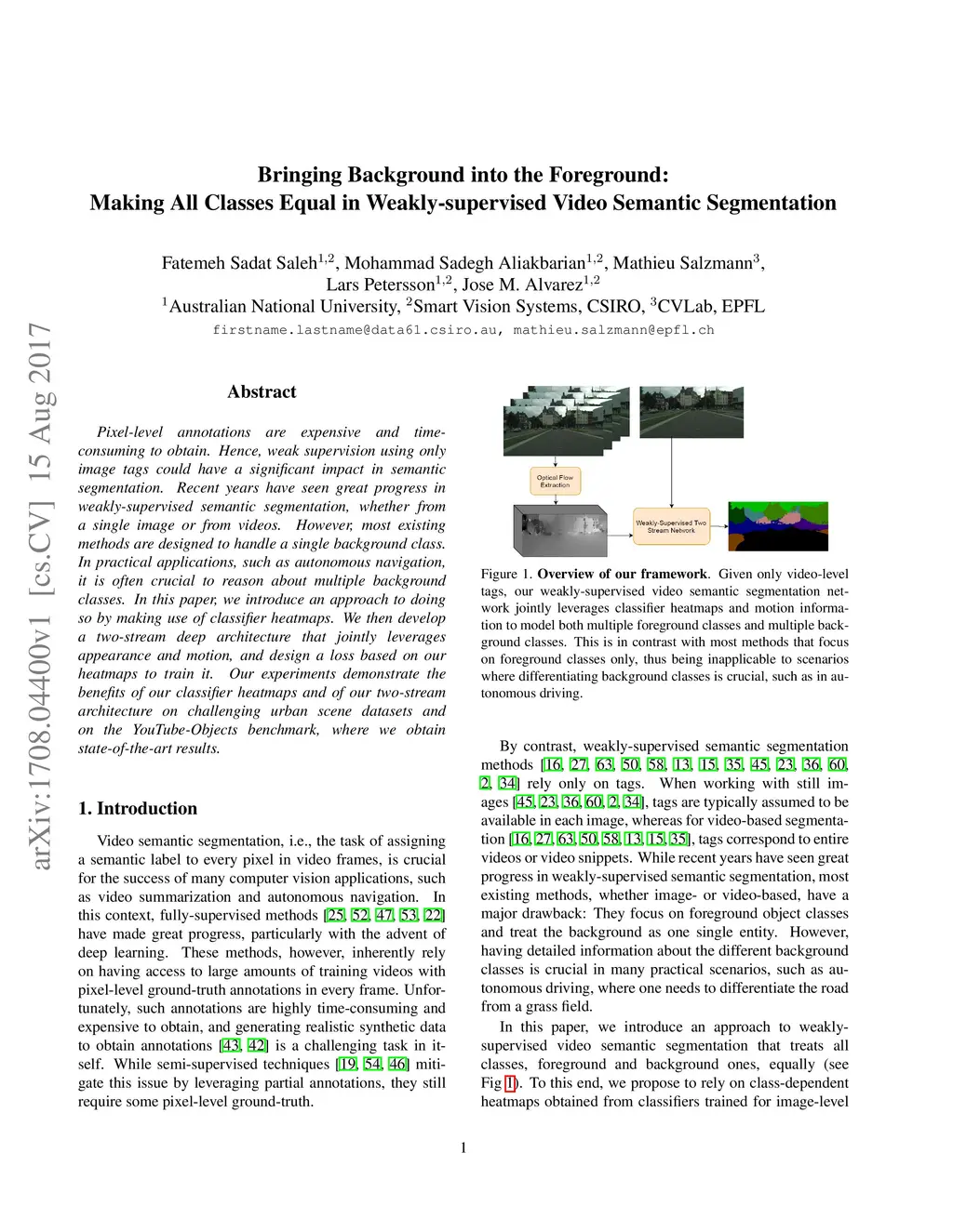 Pixel-level annotations are expensive and time-consuming to obtain. Hence, weak supervision using only image tags could have a significant impact in semantic segmentation. Recent years have seen great progress in weakly-supervised semantic segmentation, whether from a single image or from videos. However, most existing methods are designed to handle a single background class. In practical applications, such as autonomous navigation, it is often crucial to reason about multiple background classes. In this paper, we introduce an approach to doing so by making use of classifier heatmaps. We then develop a two-stream deep architecture that jointly leverages appearance and motion, and design a loss based on our heatmaps to train it. Our experiments demonstrate the benefits of our classifier heatmaps and of our two-stream architecture on challenging urban scene datasets and on the YouTube-Objects benchmark, where we obtain state-of-the-art results.