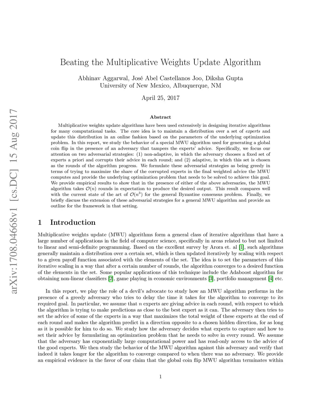 Multiplicative weights update algorithms have been used extensively in designing iterative algorithms for many computational tasks. The core idea is to maintain a distribution over a set of experts and update this distribution in an online fashion based on the parameters of the underlying optimization problem. In this report, we study the behavior of a special MWU algorithm used for generating a global coin flip in the presence of an adversary that tampers the experts' advice. Specifically, we focus our attention on two adversarial strategies: (1) non-adaptive, in which the adversary chooses a fixed set of experts a priori and corrupts their advice in each round; and (2) adaptive, in which this set is chosen as the rounds of the algorithm progress. We formulate these adversarial strategies as being greedy in terms of trying to maximize the share of the corrupted experts in the final weighted advice the MWU computes and provide the underlying optimization problem that needs to be solved to achieve this goal. We provide empirical results to show that in the presence of either of the above adversaries, the MWU algorithm takes rounds in expectation to produce the desired output. This result compares well with the current state of the art of for the general Byzantine consensus problem. Finally, we briefly discuss the extension of these adversarial strategies for a general MWU algorithm and provide an outline for the framework in that setting.