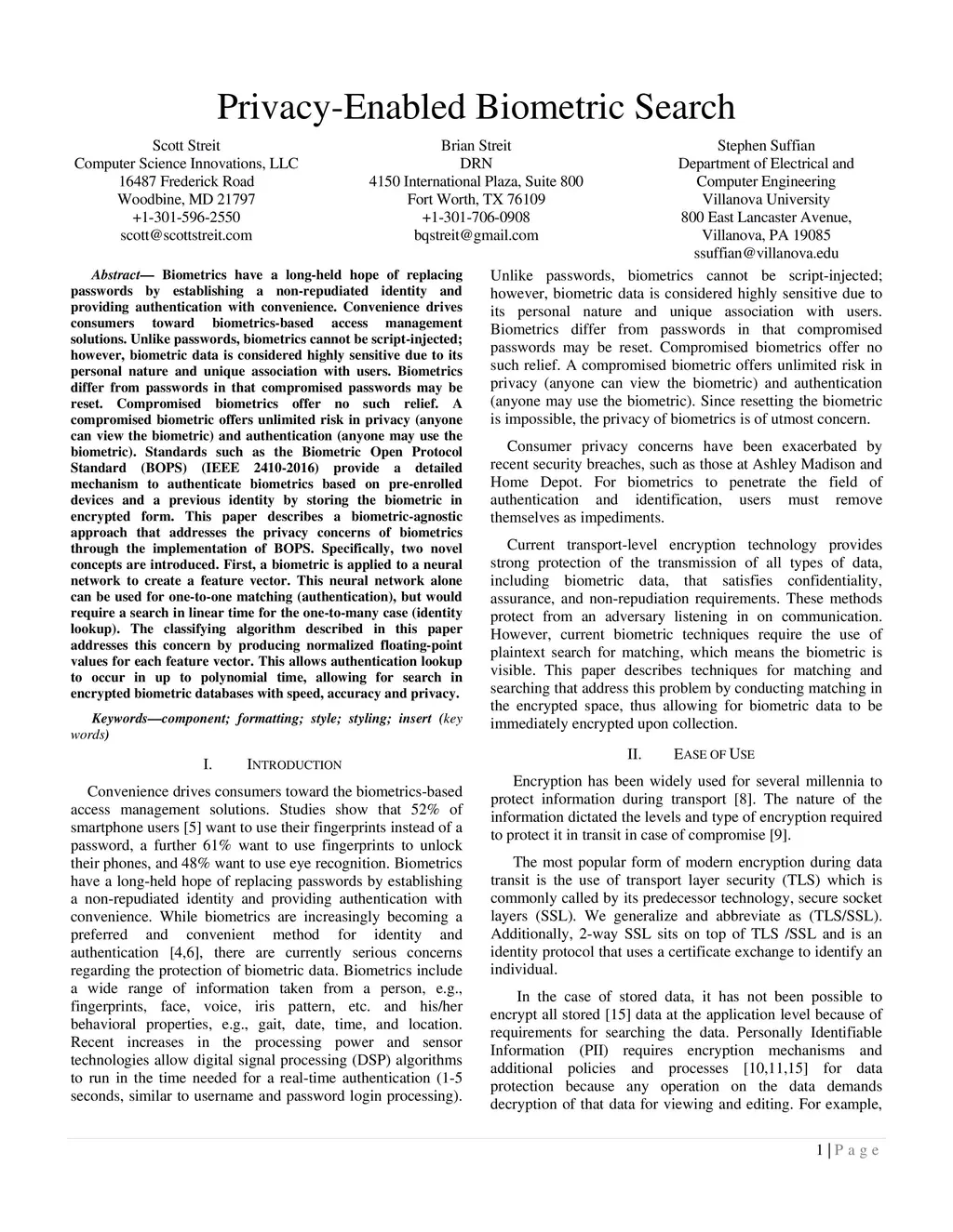 Biometrics have a long-held hope of replacing passwords by establishing a non-repudiated identity and providing authentication with convenience. Convenience drives consumers toward biometrics-based access management solutions. Unlike passwords, biometrics cannot be script-injected; however, biometric data is considered highly sensitive due to its personal nature and unique association with users. Biometrics differ from passwords in that compromised passwords may be reset. Compromised biometrics offer no such relief. A compromised biometric offers unlimited risk in privacy (anyone can view the biometric) and authentication (anyone may use the biometric). Standards such as the Biometric Open Protocol Standard (BOPS) (IEEE 2410-2016) provide a detailed mechanism to authenticate biometrics based on pre-enrolled devices and a previous identity by storing the biometric in encrypted form. This paper describes a biometric-agnostic approach that addresses the privacy concerns of biometrics through the implementation of BOPS. Specifically, two novel concepts are introduced. First, a biometric is applied to a neural network to create a feature vector. This neural network alone can be used for one-to-one matching (authentication), but would require a search in linear time for the one-to-many case (identity lookup). The classifying algorithm described in this paper addresses this concern by producing normalized floating-point values for each feature vector. This allows authentication lookup to occur in up to polynomial time, allowing for search in encrypted biometric databases with speed, accuracy and privacy.