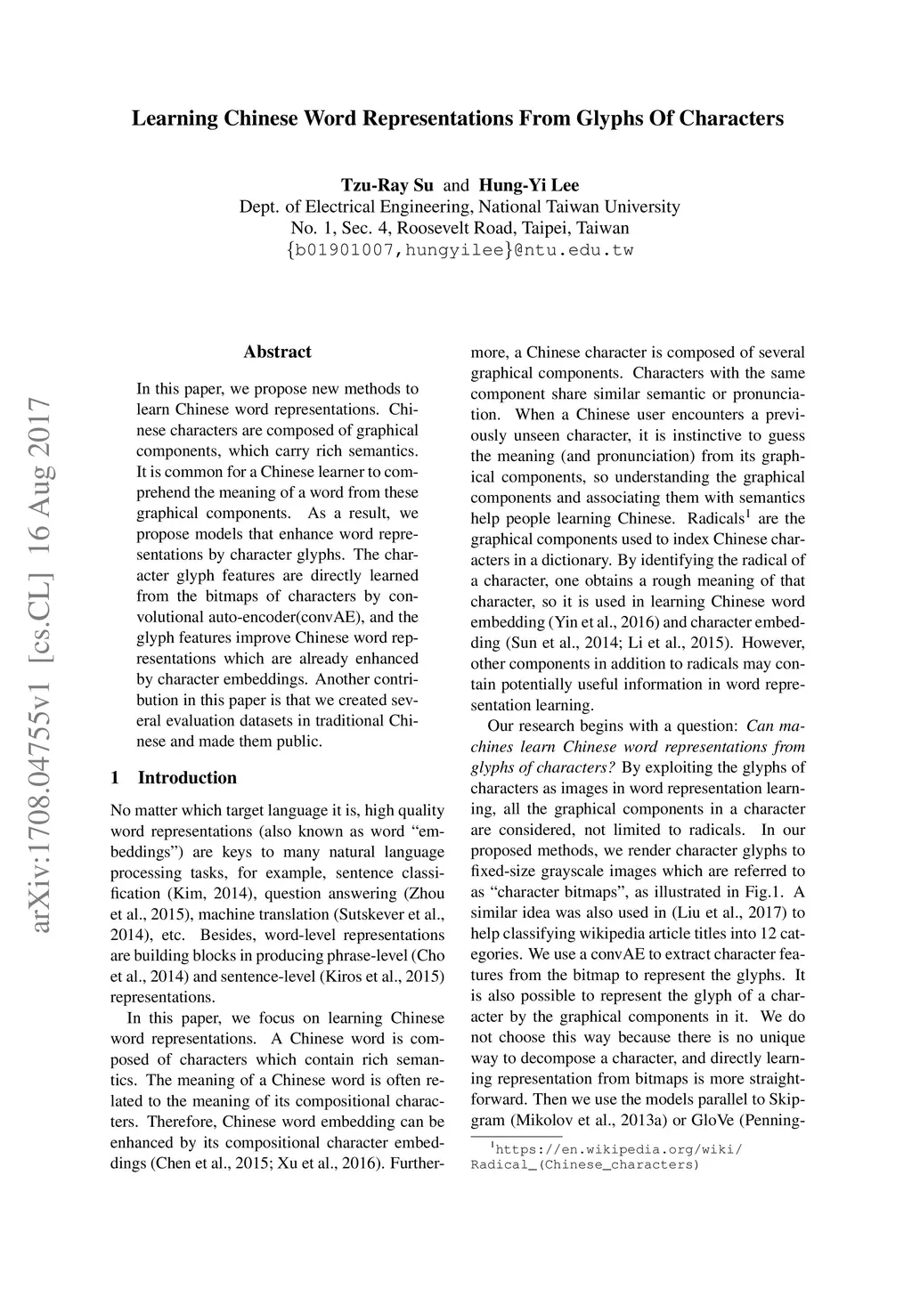 In this paper, we propose new methods to learn Chinese word representations. Chinese characters are composed of graphical components, which carry rich semantics. It is common for a Chinese learner to comprehend the meaning of a word from these graphical components. As a result, we propose models that enhance word representations by character glyphs. The character glyph features are directly learned from the bitmaps of characters by convolutional auto-encoder(convAE), and the glyph features improve Chinese word representations which are already enhanced by character embeddings. Another contribution in this paper is that we created several evaluation datasets in traditional Chinese and made them public.