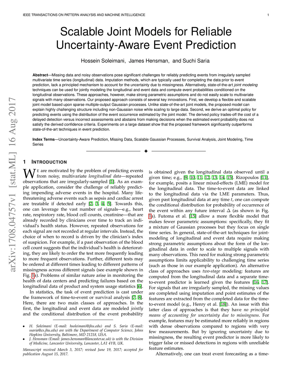 Missing data and noisy observations pose significant challenges for reliably predicting events from irregularly sampled multivariate time series (longitudinal) data. Imputation methods, which are typically used for completing the data prior to event prediction, lack a principled mechanism to account for the uncertainty due to missingness. Alternatively, state-of-the-art joint modeling techniques can be used for jointly modeling the longitudinal and event data and compute event probabilities conditioned on the longitudinal observations. These approaches, however, make strong parametric assumptions and do not easily scale to multivariate signals with many observations. Our proposed approach consists of several key innovations. First, we develop a flexible and scalable joint model based upon sparse multiple-output Gaussian processes. Unlike state-of-the-art joint models, the proposed model can explain highly challenging structure including non-Gaussian noise while scaling to large data. Second, we derive an optimal policy for predicting events using the distribution of the event occurrence estimated by the joint model. The derived policy trades-off the cost of a delayed detection versus incorrect assessments and abstains from making decisions when the estimated event probability does not satisfy the derived confidence criteria. Experiments on a large dataset show that the proposed framework significantly outperforms state-of-the-art techniques in event prediction.