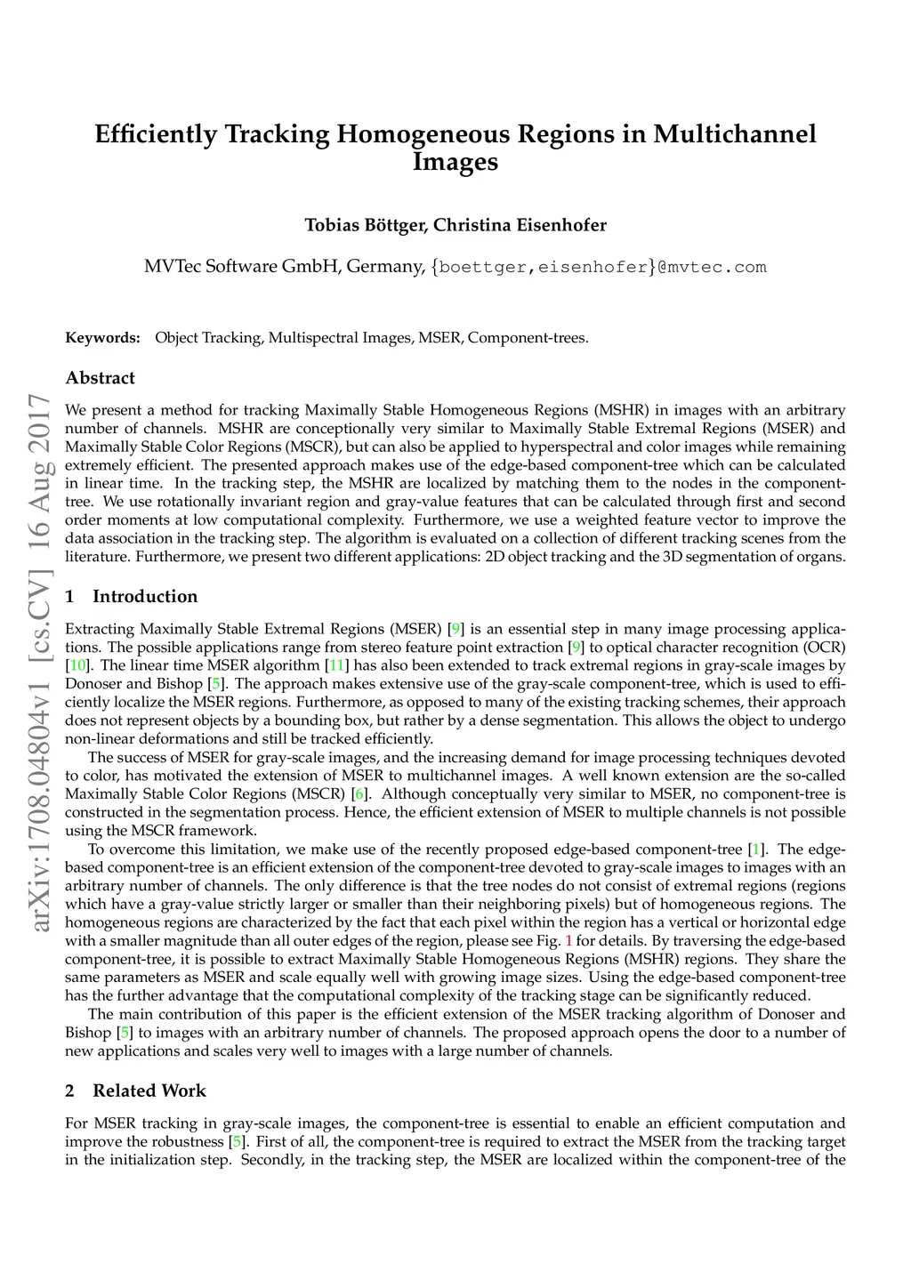 We present a method for tracking Maximally Stable Homogeneous Regions (MSHR) in images with an arbitrary number of channels. MSHR are conceptionally very similar to Maximally Stable Extremal Regions (MSER) and Maximally Stable Color Regions (MSCR), but can also be applied to hyperspectral and color images while remaining extremely efficient. The presented approach makes use of the edge-based component-tree which can be calculated in linear time. In the tracking step, the MSHR are localized by matching them to the nodes in the component-tree. We use rotationally invariant region and gray-value features that can be calculated through first and second order moments at low computational complexity. Furthermore, we use a weighted feature vector to improve the data association in the tracking step. The algorithm is evaluated on a collection of different tracking scenes from the literature. Furthermore, we present two different applications: 2D object tracking and the 3D segmentation of organs.