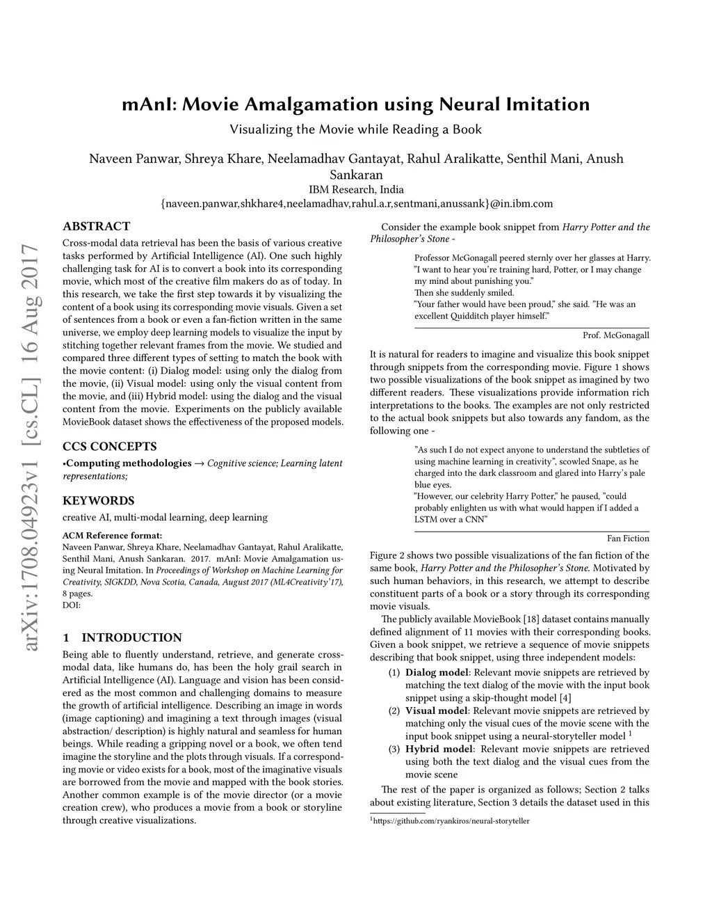 Cross-modal data retrieval has been the basis of various creative tasks performed by Artificial Intelligence (AI). One such highly challenging task for AI is to convert a book into its corresponding movie, which most of the creative film makers do as of today. In this research, we take the first step towards it by visualizing the content of a book using its corresponding movie visuals. Given a set of sentences from a book or even a fan-fiction written in the same universe, we employ deep learning models to visualize the input by stitching together relevant frames from the movie. We studied and compared three different types of setting to match the book with the movie content: (i) Dialog model: using only the dialog from the movie, (ii) Visual model: using only the visual content from the movie, and (iii) Hybrid model: using the dialog and the visual content from the movie. Experiments on the publicly available MovieBook dataset shows the effectiveness of the proposed models.