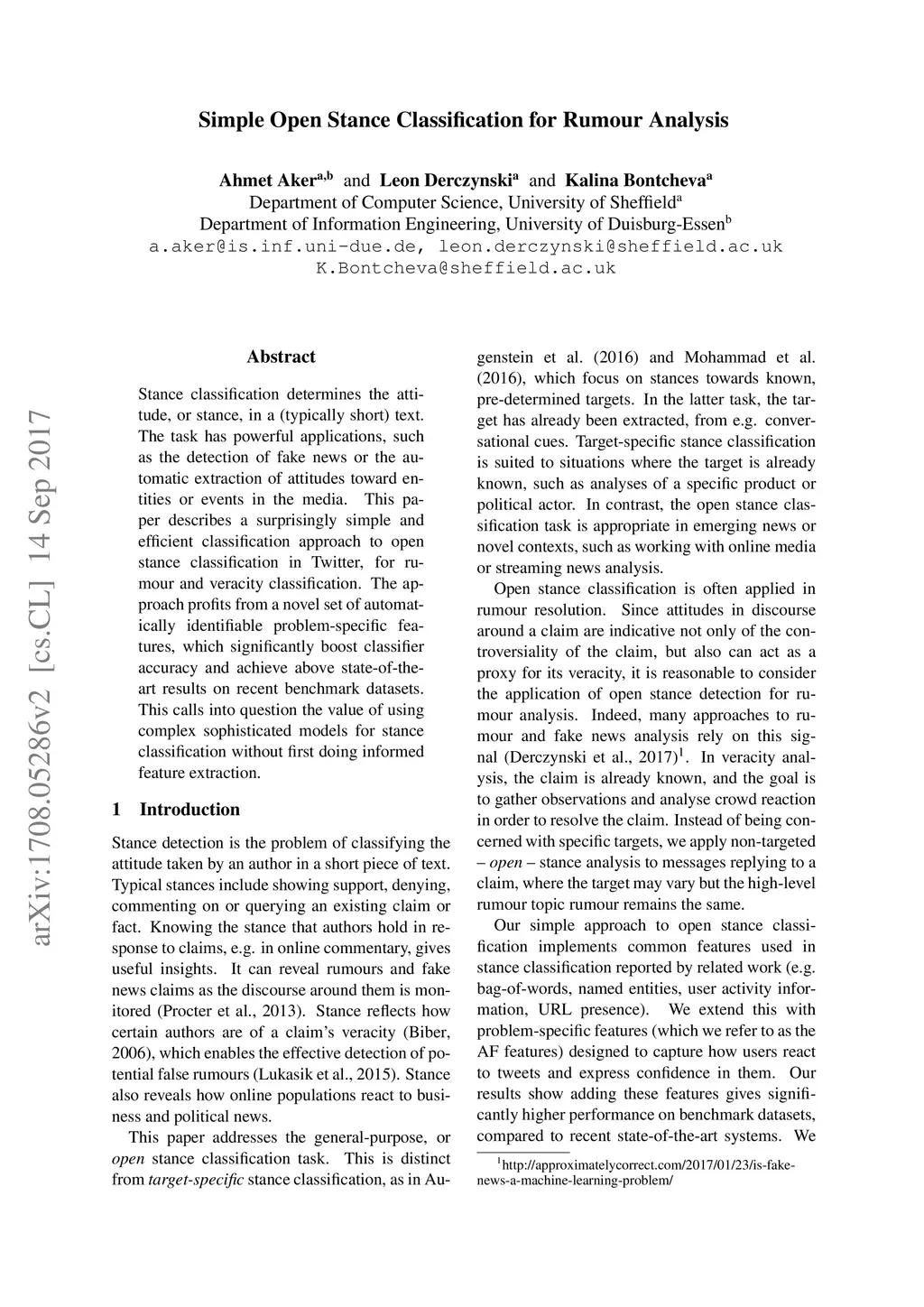 Stance classification determines the attitude, or stance, in a (typically short) text. The task has powerful applications, such as the detection of fake news or the automatic extraction of attitudes toward entities or events in the media. This paper describes a surprisingly simple and efficient classification approach to open stance classification in Twitter, for rumour and veracity classification. The approach profits from a novel set of automatically identifiable problem-specific features, which significantly boost classifier accuracy and achieve above state-of-the-art results on recent benchmark datasets. This calls into question the value of using complex sophisticated models for stance classification without first doing informed feature extraction.