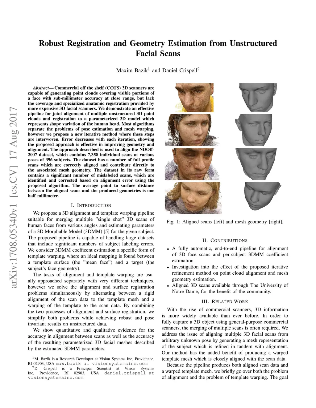 Commercial off the shelf (COTS) 3D scanners are capable of generating point clouds covering visible portions of a face with sub-millimeter accuracy at close range, but lack the coverage and specialized anatomic registration provided by more expensive 3D facial scanners. We demonstrate an effective pipeline for joint alignment of multiple unstructured 3D point clouds and registration to a parameterized 3D model which represents shape variation of the human head. Most algorithms separate the problems of pose estimation and mesh warping, however we propose a new iterative method where these steps are interwoven. Error decreases with each iteration, showing the proposed approach is effective in improving geometry and alignment. The approach described is used to align the NDOff-2007 dataset, which contains 7,358 individual scans at various poses of 396 subjects. The dataset has a number of full profile scans which are correctly aligned and contribute directly to the associated mesh geometry. The dataset in its raw form contains a significant number of mislabeled scans, which are identified and corrected based on alignment error using the proposed algorithm. The average point to surface distance between the aligned scans and the produced geometries is one half millimeter.
