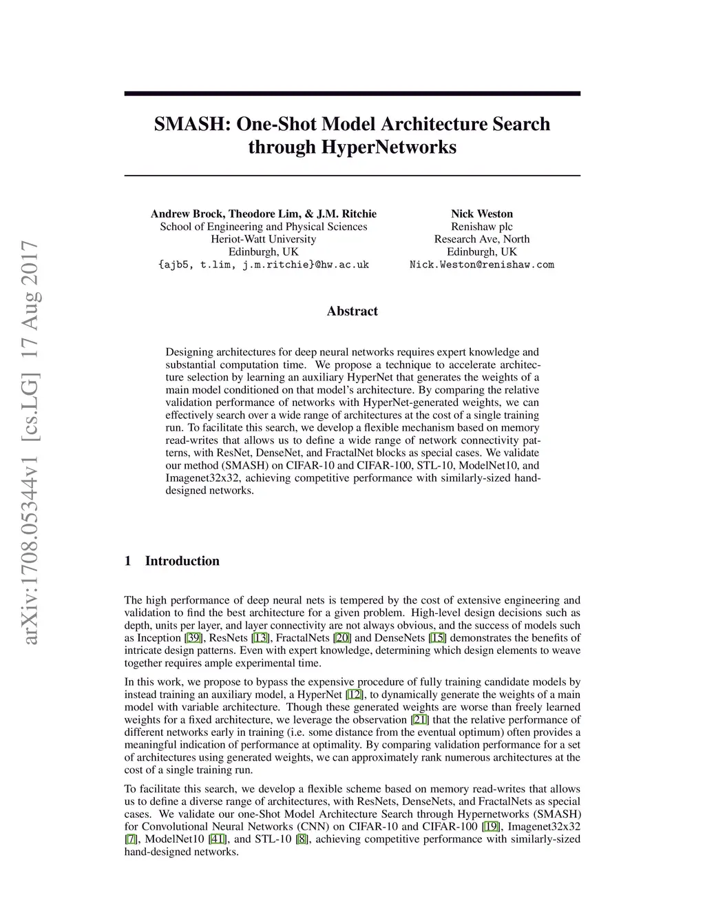 SMASH: One-Shot Model Architecture Search through HyperNetworks
