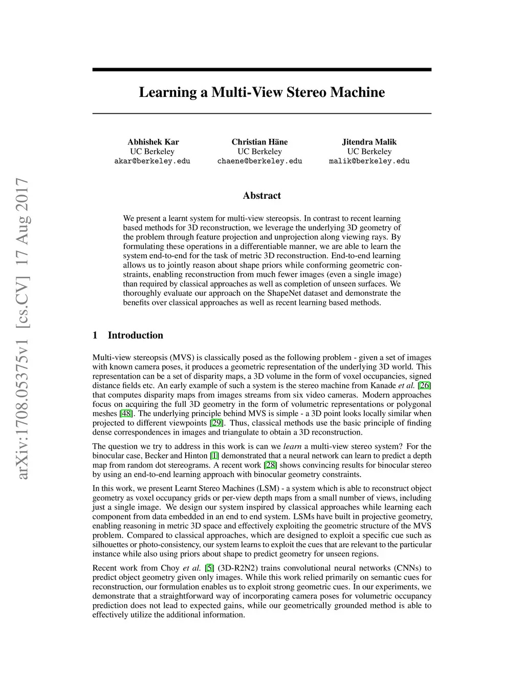 We present a learnt system for multi-view stereopsis. In contrast to recent learning based methods for 3D reconstruction, we leverage the underlying 3D geometry of the problem through feature projection and unprojection along viewing rays. By formulating these operations in a differentiable manner, we are able to learn the system end-to-end for the task of metric 3D reconstruction. End-to-end learning allows us to jointly reason about shape priors while conforming geometric constraints, enabling reconstruction from much fewer images (even a single image) than required by classical approaches as well as completion of unseen surfaces. We thoroughly evaluate our approach on the ShapeNet dataset and demonstrate the benefits over classical approaches as well as recent learning based methods.