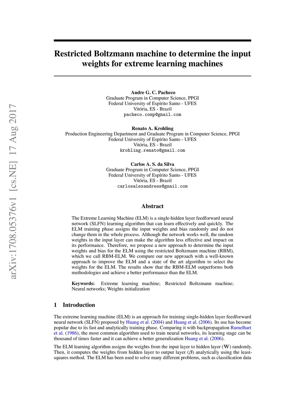The Extreme Learning Machine (ELM) is a single-hidden layer feedforward neural network (SLFN) learning algorithm that can learn effectively and quickly. The ELM training phase assigns the input weights and bias randomly and does not change them in the whole process. Although the network works well, the random weights in the input layer can make the algorithm less effective and impact on its performance. Therefore, we propose a new approach to determine the input weights and bias for the ELM using the restricted Boltzmann machine (RBM), which we call RBM-ELM. We compare our new approach with a well-known approach to improve the ELM and a state of the art algorithm to select the weights for the ELM. The results show that the RBM-ELM outperforms both methodologies and achieve a better performance than the ELM.