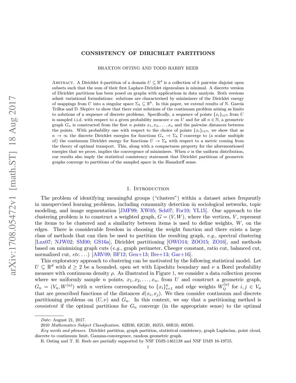 A Dirichlet -partition of a domain is a collection of pairwise disjoint open subsets such that the sum of their first Laplace-Dirichlet eigenvalues is minimal. A discrete version of Dirichlet partitions has been posed on graphs with applications in data analysis. Both versions admit variational formulations: solutions are characterized by minimizers of the Dirichlet energy of mappings from into a singular space . In this paper, we extend results of N.\ Garc\ía Trillos and D.\ Slep\v{c}ev to show that there exist solutions of the continuum problem arising as limits to solutions of a sequence of discrete problems. Specifically, a sequence of points from is sampled i.i.d.\ with respect to a given probability measure on and for all , a geometric graph is constructed from the first points and the pairwise distances between the points. With probability one with respect to the choice of points , we show that as the discrete Dirichlet energies for functions -converge to (a scalar multiple of) the continuum Dirichlet energy for functions with respect to a metric coming from the theory of optimal transport. This, along with a compactness property for the aforementioned energies that we prove, implies the convergence of minimizers. When is the uniform distribution, our results also imply the statistical consistency statement that Dirichlet partitions of geometric graphs converge to partitions of the sampled space in the Hausdorff sense.