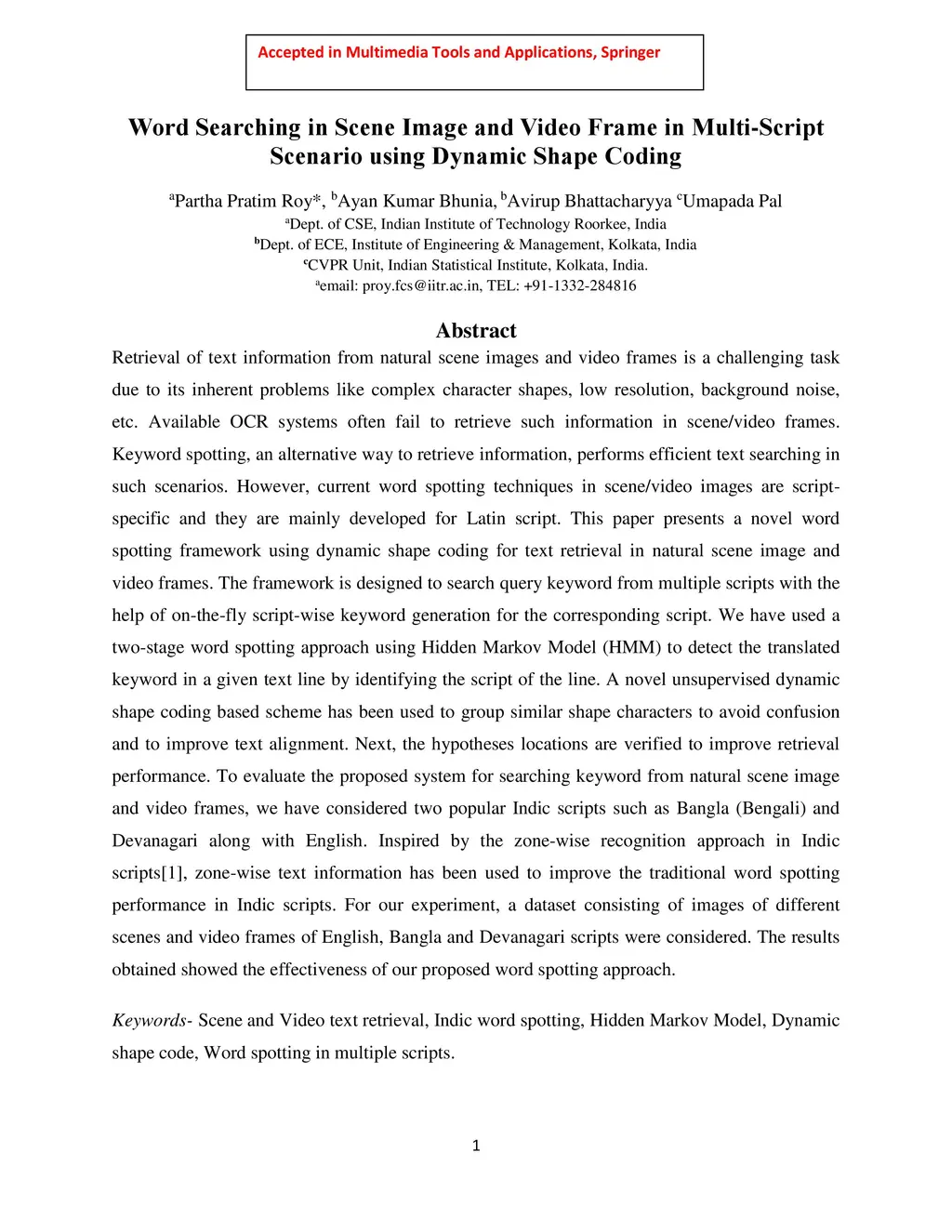 Retrieval of text information from natural scene images and video frames is a challenging task due to its inherent problems like complex character shapes, low resolution, background noise, etc. Available OCR systems often fail to retrieve such information in scene/video frames. Keyword spotting, an alternative way to retrieve information, performs efficient text searching in such scenarios. However, current word spotting techniques in scene/video images are script-specific and they are mainly developed for Latin script. This paper presents a novel word spotting framework using dynamic shape coding for text retrieval in natural scene image and video frames. The framework is designed to search query keyword from multiple scripts with the help of on-the-fly script-wise keyword generation for the corresponding script. We have used a two-stage word spotting approach using Hidden Markov Model (HMM) to detect the translated keyword in a given text line by identifying the script of the line. A novel unsupervised dynamic shape coding based scheme has been used to group similar shape characters to avoid confusion and to improve text alignment. Next, the hypotheses locations are verified to improve retrieval performance. To evaluate the proposed system for searching keyword from natural scene image and video frames, we have considered two popular Indic scripts such as Bangla (Bengali) and Devanagari along with English. Inspired by the zone-wise recognition approach in Indic scripts[1], zone-wise text information has been used to improve the traditional word spotting performance in Indic scripts. For our experiment, a dataset consisting of images of different scenes and video frames of English, Bangla and Devanagari scripts were considered. The results obtained showed the effectiveness of our proposed word spotting approach.