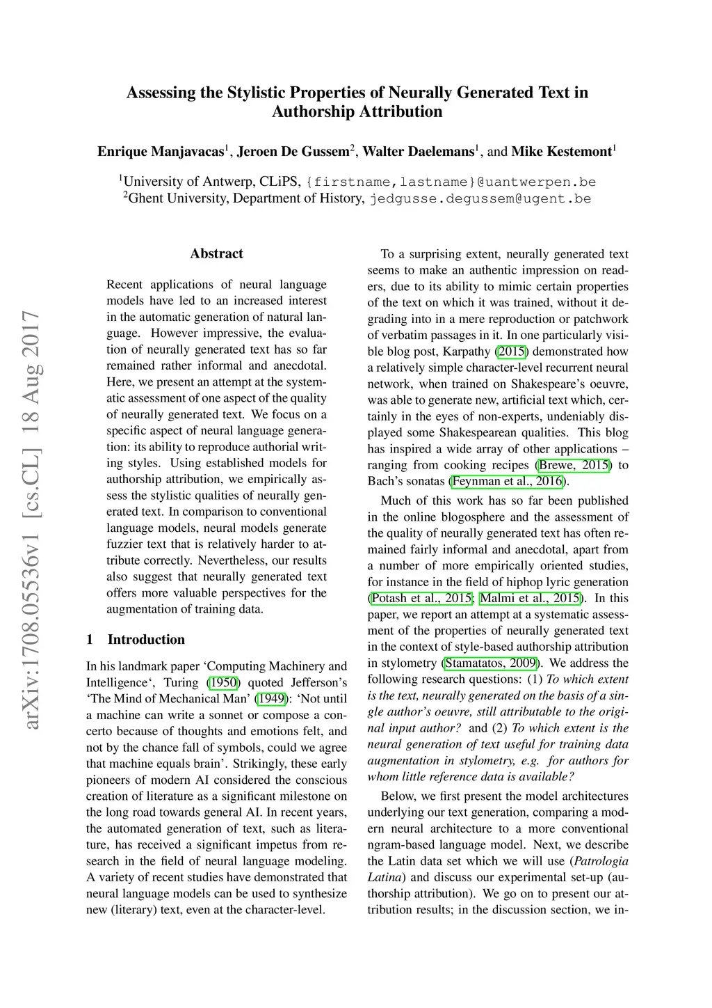 Recent applications of neural language models have led to an increased interest in the automatic generation of natural language. However impressive, the evaluation of neurally generated text has so far remained rather informal and anecdotal. Here, we present an attempt at the systematic assessment of one aspect of the quality of neurally generated text. We focus on a specific aspect of neural language generation: its ability to reproduce authorial writing styles. Using established models for authorship attribution, we empirically assess the stylistic qualities of neurally generated text. In comparison to conventional language models, neural models generate fuzzier text that is relatively harder to attribute correctly. Nevertheless, our results also suggest that neurally generated text offers more valuable perspectives for the augmentation of training data.