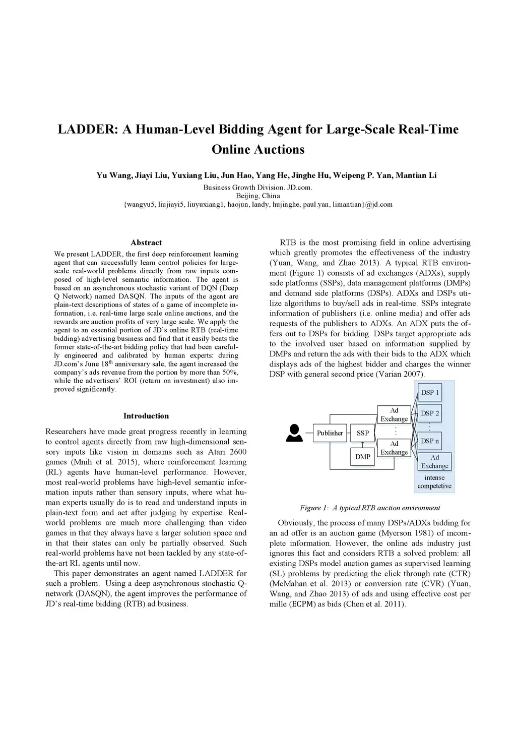 We present LADDER, the first deep reinforcement learning agent that can successfully learn control policies for large-scale real-world problems directly from raw inputs composed of high-level semantic information. The agent is based on an asynchronous stochastic variant of DQN (Deep Q Network) named DASQN. The inputs of the agent are plain-text descriptions of states of a game of incomplete information, i.e. real-time large scale online auctions, and the rewards are auction profits of very large scale. We apply the agent to an essential portion of JD's online RTB (real-time bidding) advertising business and find that it easily beats the former state-of-the-art bidding policy that had been carefully engineered and calibrated by human experts: during JD.com's June 18th anniversary sale, the agent increased the company's ads revenue from the portion by more than 50%, while the advertisers' ROI (return on investment) also improved significantly.