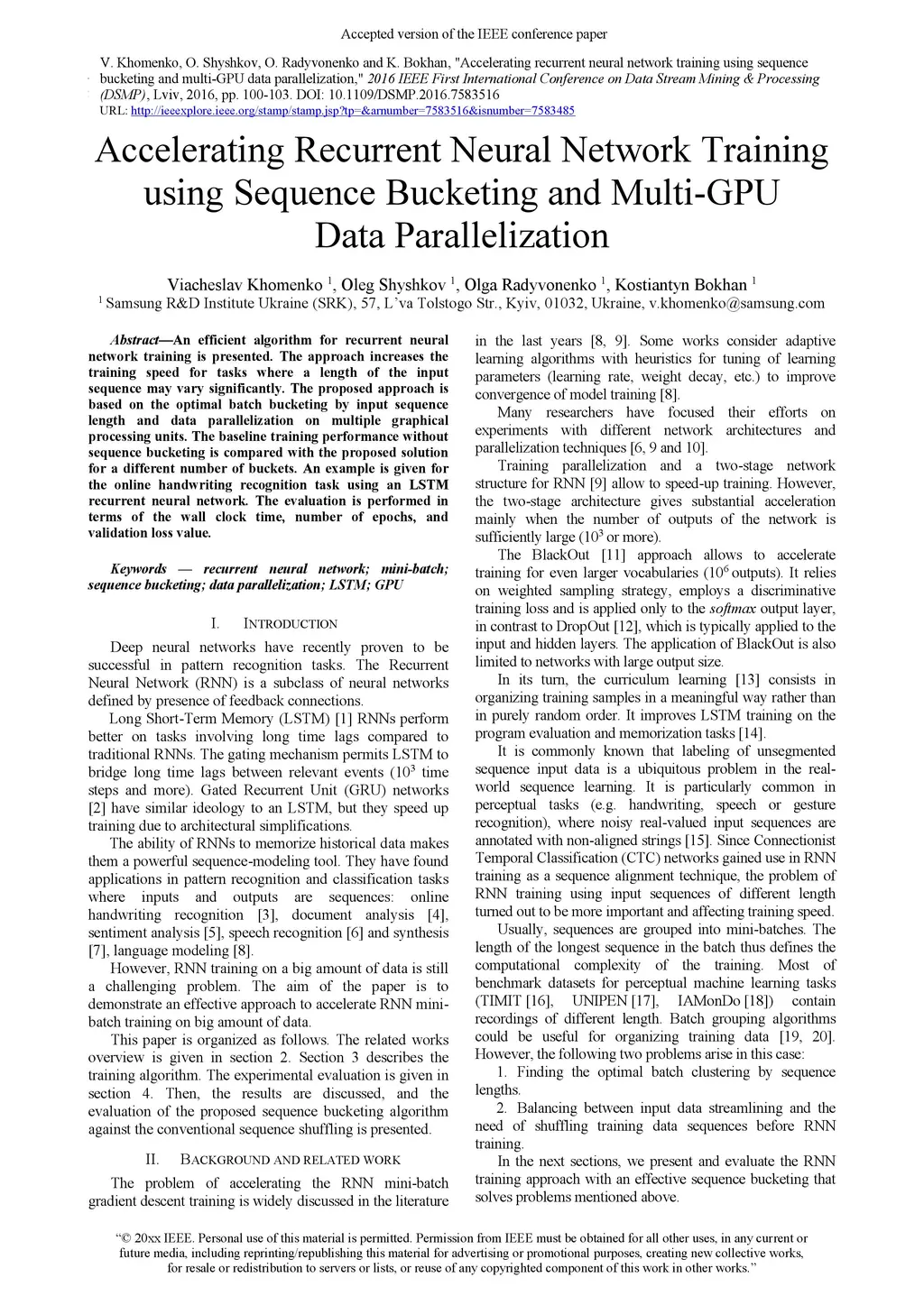 An efficient algorithm for recurrent neural network training is presented. The approach increases the training speed for tasks where a length of the input sequence may vary significantly. The proposed approach is based on the optimal batch bucketing by input sequence length and data parallelization on multiple graphical processing units. The baseline training performance without sequence bucketing is compared with the proposed solution for a different number of buckets. An example is given for the online handwriting recognition task using an LSTM recurrent neural network. The evaluation is performed in terms of the wall clock time, number of epochs, and validation loss value.