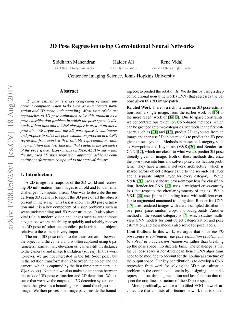 3D pose estimation is a key component of many important computer vision tasks such as autonomous navigation and 3D scene understanding. Most state-of-the-art approaches to 3D pose estimation solve this problem as a pose-classification problem in which the pose space is discretized into bins and a CNN classifier is used to predict a pose bin. We argue that the 3D pose space is continuous and propose to solve the pose estimation problem in a CNN regression framework with a suitable representation, data augmentation and loss function that captures the geometry of the pose space. Experiments on PASCAL3D+ show that the proposed 3D pose regression approach achieves competitive performance compared to the state-of-the-art.