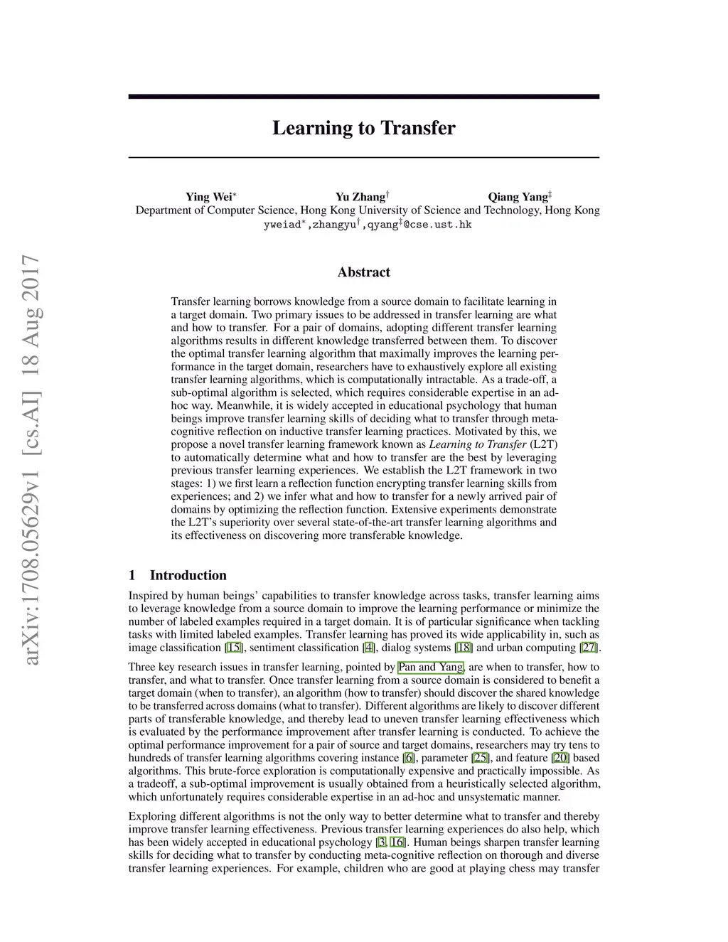 Transfer learning borrows knowledge from a source domain to facilitate learning in a target domain. Two primary issues to be addressed in transfer learning are what and how to transfer. For a pair of domains, adopting different transfer learning algorithms results in different knowledge transferred between them. To discover the optimal transfer learning algorithm that maximally improves the learning performance in the target domain, researchers have to exhaustively explore all existing transfer learning algorithms, which is computationally intractable. As a trade-off, a sub-optimal algorithm is selected, which requires considerable expertise in an ad-hoc way. Meanwhile, it is widely accepted in educational psychology that human beings improve transfer learning skills of deciding what to transfer through meta-cognitive reflection on inductive transfer learning practices. Motivated by this, we propose a novel transfer learning framework known as Learning to Transfer (L2T) to automatically determine what and how to transfer are the best by leveraging previous transfer learning experiences. We establish the L2T framework in two stages: 1) we first learn a reflection function encrypting transfer learning skills from experiences; and 2) we infer what and how to transfer for a newly arrived pair of domains by optimizing the reflection function. Extensive experiments demonstrate the L2T's superiority over several state-of-the-art transfer learning algorithms and its effectiveness on discovering more transferable knowledge.