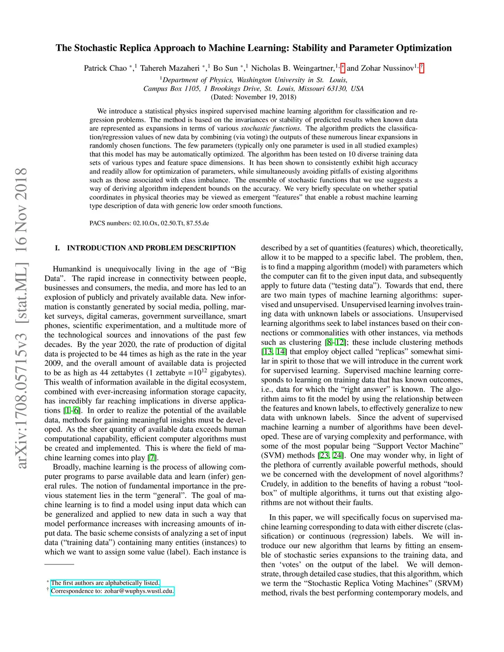 We introduce a statistical physics inspired supervised machine learning algorithm for classification and regression problems. The method is based on the invariances or stability of predicted results when known data is represented as expansions in terms of various stochastic functions. The algorithm predicts the classification/regression values of new data by combining (via voting) the outputs of these numerous linear expansions in randomly chosen functions. The few parameters (typically only one parameter is used in all studied examples) that this model has may be automatically optimized. The algorithm has been tested on 10 diverse training data sets of various types and feature space dimensions. It has been shown to consistently exhibit high accuracy and readily allow for optimization of parameters, while simultaneously avoiding pitfalls of existing algorithms such as those associated with class imbalance. We very briefly speculate on whether spatial coordinates in physical theories may be viewed as emergent "features" that enable a robust machine learning type description of data with generic low order smooth functions.
