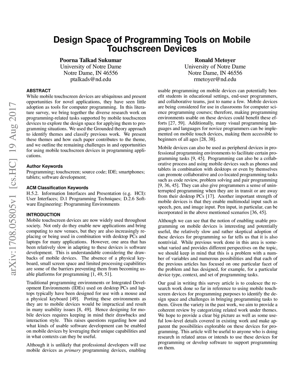 While mobile touchscreen devices are ubiquitous and present opportunities for novel applications, they have seen little adoption as tools for computer programming. In this literature survey, we bring together the diverse research work on programming-related tasks supported by mobile touchscreen devices to explore the design space for applying them to programming situations. We used the Grounded theory approach to identify themes and classify previous work. We present these themes and how each paper contributes to the theme, and we outline the remaining challenges in and opportunities for using mobile touchscreen devices in programming applications.