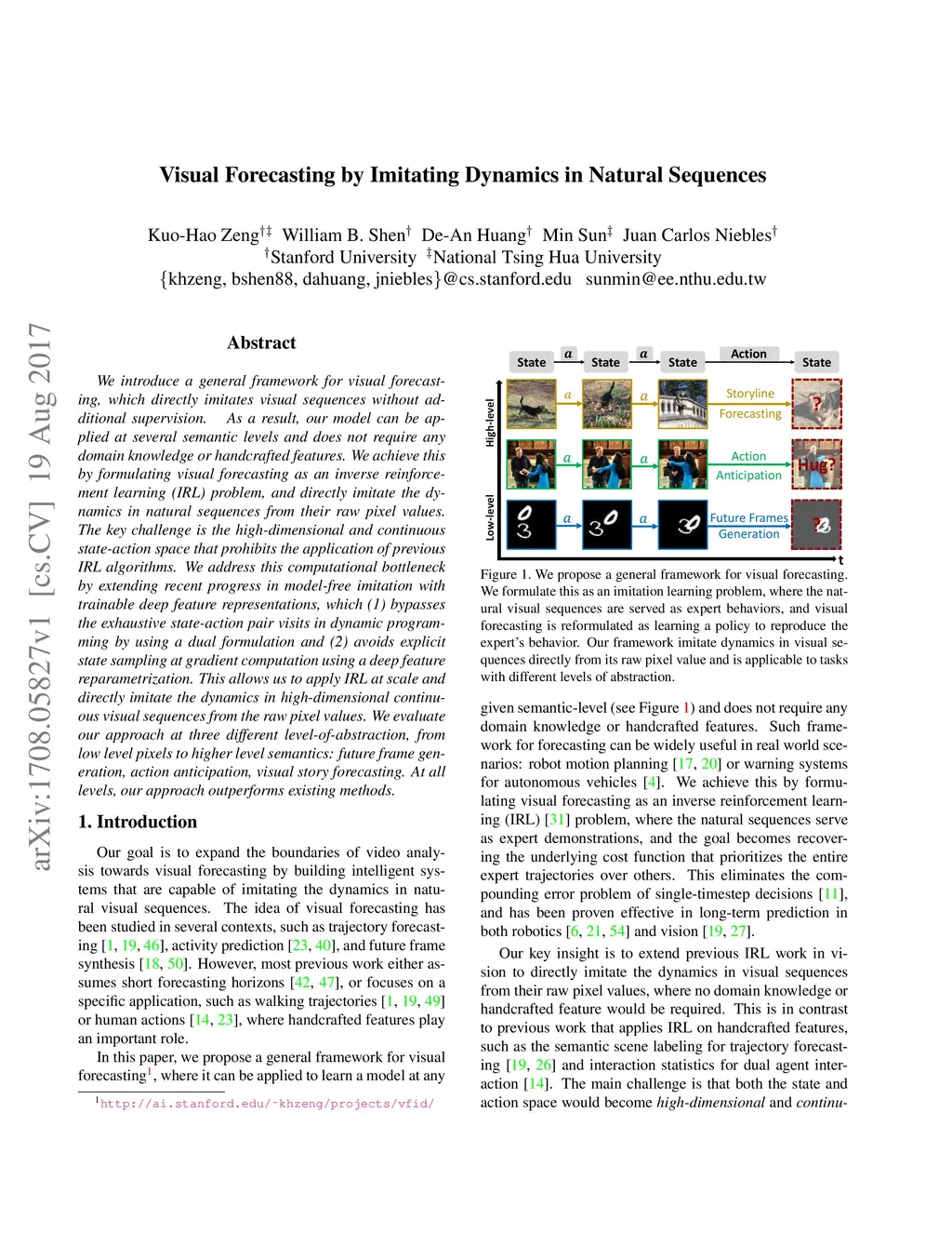 We introduce a general framework for visual forecasting, which directly imitates visual sequences without additional supervision. As a result, our model can be applied at several semantic levels and does not require any domain knowledge or handcrafted features. We achieve this by formulating visual forecasting as an inverse reinforcement learning (IRL) problem, and directly imitate the dynamics in natural sequences from their raw pixel values. The key challenge is the high-dimensional and continuous state-action space that prohibits the application of previous IRL algorithms. We address this computational bottleneck by extending recent progress in model-free imitation with trainable deep feature representations, which (1) bypasses the exhaustive state-action pair visits in dynamic programming by using a dual formulation and (2) avoids explicit state sampling at gradient computation using a deep feature reparametrization. This allows us to apply IRL at scale and directly imitate the dynamics in high-dimensional continuous visual sequences from the raw pixel values. We evaluate our approach at three different level-of-abstraction, from low level pixels to higher level semantics: future frame generation, action anticipation, visual story forecasting. At all levels, our approach outperforms existing methods.