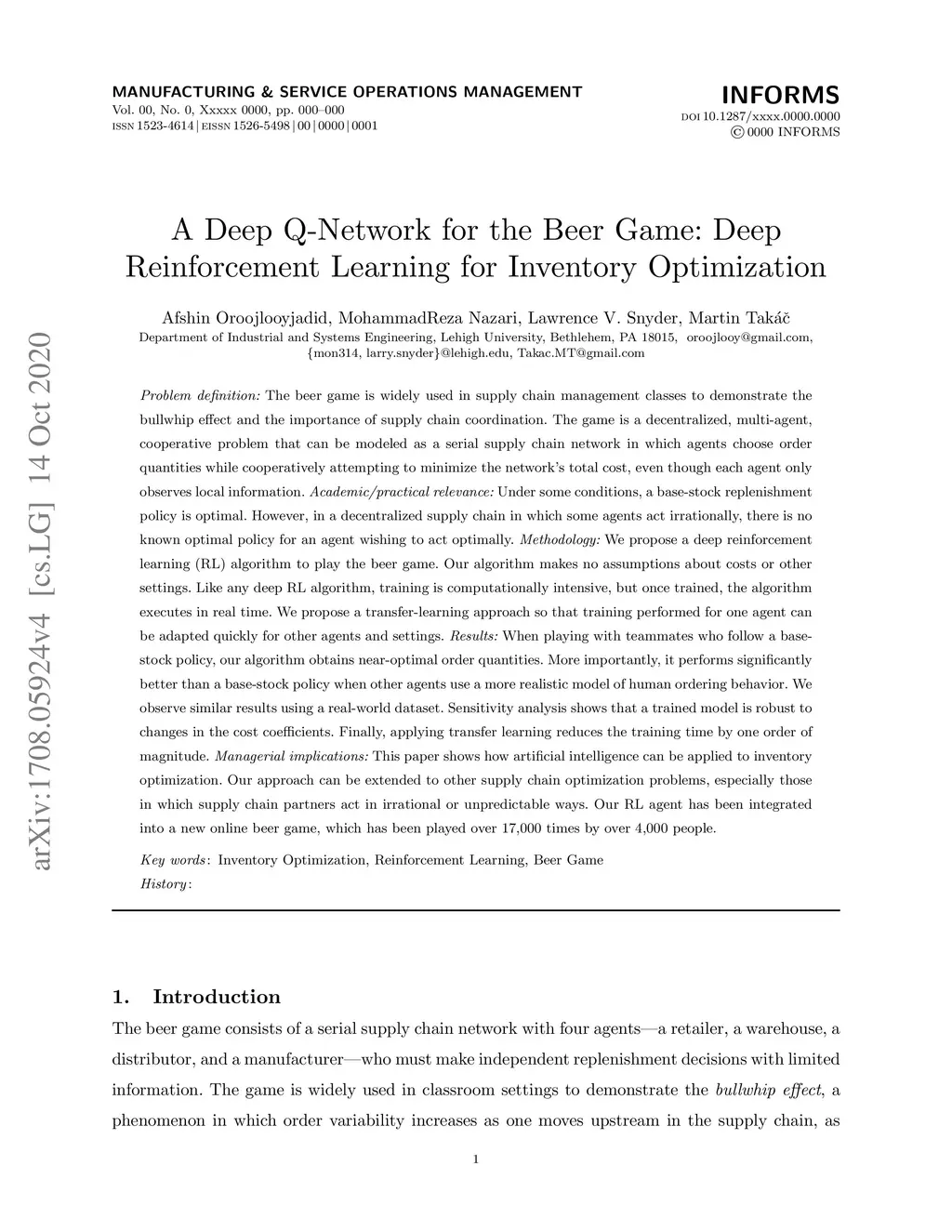 A Deep Q-Network for the Beer Game: A Deep Reinforcement Learning