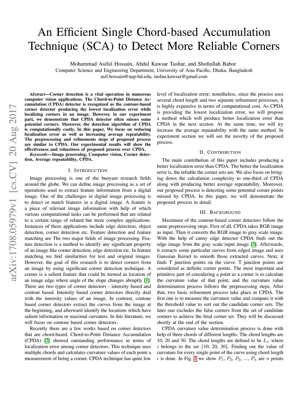 Corner detection is a vital operation in numerous computer vision applications. The Chord-to-Point Distance Accumulation (CPDA) detector is recognized as the contour-based corner detector producing the lowest localization error while localizing corners in an image. However, in our experiment part, we demonstrate that CPDA detector often misses some potential corners. Moreover, the detection algorithm of CPDA is computationally costly. In this paper, We focus on reducing localization error as well as increasing average repeatability. The preprocessing and refinements steps of proposed process are similar to CPDA. Our experimental results will show the effectiveness and robustness of proposed process over CPDA.