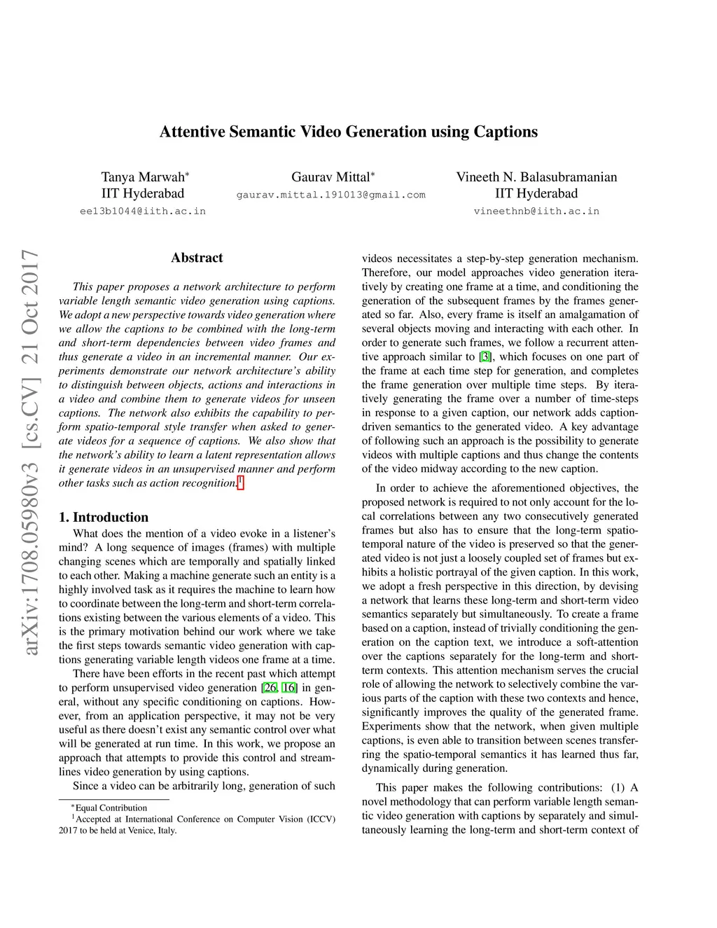 This paper proposes a network architecture to perform variable length semantic video generation using captions. We adopt a new perspective towards video generation where we allow the captions to be combined with the long-term and short-term dependencies between video frames and thus generate a video in an incremental manner. Our experiments demonstrate our network architecture's ability to distinguish between objects, actions and interactions in a video and combine them to generate videos for unseen captions. The network also exhibits the capability to perform spatio-temporal style transfer when asked to generate videos for a sequence of captions. We also show that the network's ability to learn a latent representation allows it generate videos in an unsupervised manner and perform other tasks such as action recognition. (Accepted in International Conference in Computer Vision (ICCV) 2017)
