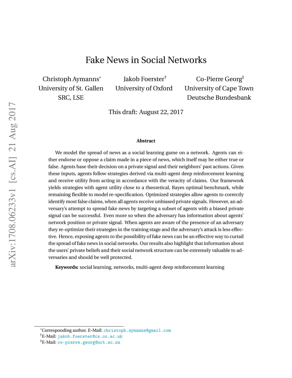 We propose multi-agent reinforcement learning as a new method for modeling fake news in social networks. This method allows us to model human behavior in social networks both in unaccustomed populations and in populations that have adapted to the presence of fake news. In particular the latter is challenging for existing methods. We find that a fake-news attack is more effective if it targets highly connected people and people with weaker private information. Attacks are more effective when the disinformation is spread across several agents than when the disinformation is concentrated with more intensity on fewer agents. Furthermore, fake news spread less well in balanced networks than in clustered networks. We test a part of our findings in a human-subject experiment. The experimental evidence provides support for the predictions from the model, suggesting that the model is suitable to analyze the spread of fake news in social networks.