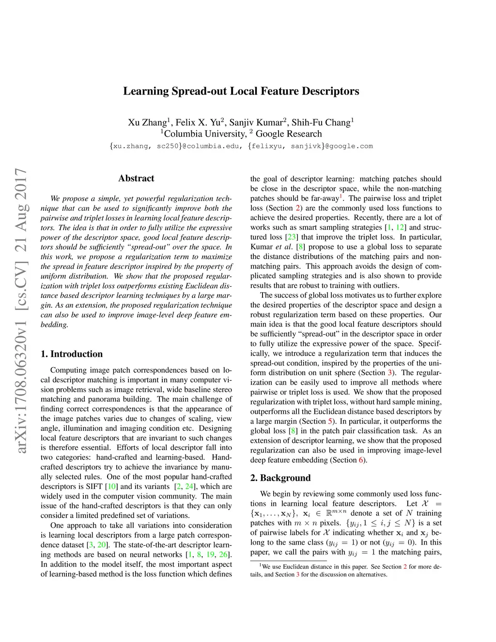 We propose a simple, yet powerful regularization technique that can be used to significantly improve both the pairwise and triplet losses in learning local feature descriptors. The idea is that in order to fully utilize the expressive power of the descriptor space, good local feature descriptors should be sufficiently "spread-out" over the space. In this work, we propose a regularization term to maximize the spread in feature descriptor inspired by the property of uniform distribution. We show that the proposed regularization with triplet loss outperforms existing Euclidean distance based descriptor learning techniques by a large margin. As an extension, the proposed regularization technique can also be used to improve image-level deep feature embedding.