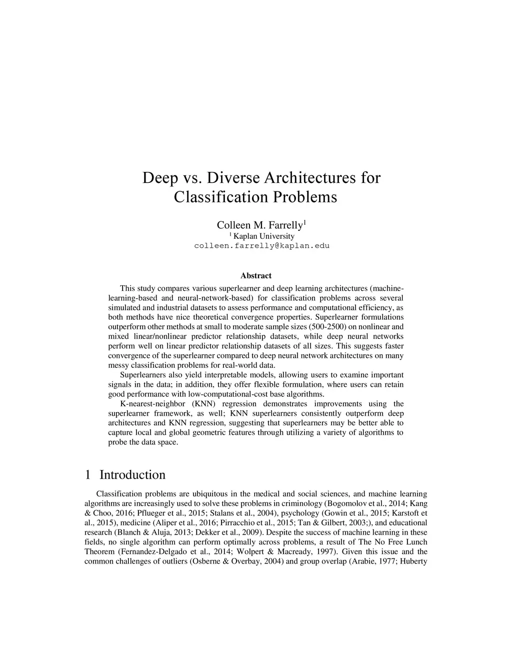 This study compares various superlearner and deep learning architectures (machine-learning-based and neural-network-based) for classification problems across several simulated and industrial datasets to assess performance and computational efficiency, as both methods have nice theoretical convergence properties. Superlearner formulations outperform other methods at small to moderate sample sizes (500-2500) on nonlinear and mixed linear/nonlinear predictor relationship datasets, while deep neural networks perform well on linear predictor relationship datasets of all sizes. This suggests faster convergence of the superlearner compared to deep neural network architectures on many messy classification problems for real-world data. Superlearners also yield interpretable models, allowing users to examine important signals in the data; in addition, they offer flexible formulation, where users can retain good performance with low-computational-cost base algorithms. K-nearest-neighbor (KNN) regression demonstrates improvements using the superlearner framework, as well; KNN superlearners consistently outperform deep architectures and KNN regression, suggesting that superlearners may be better able to capture local and global geometric features through utilizing a variety of algorithms to probe the data space.