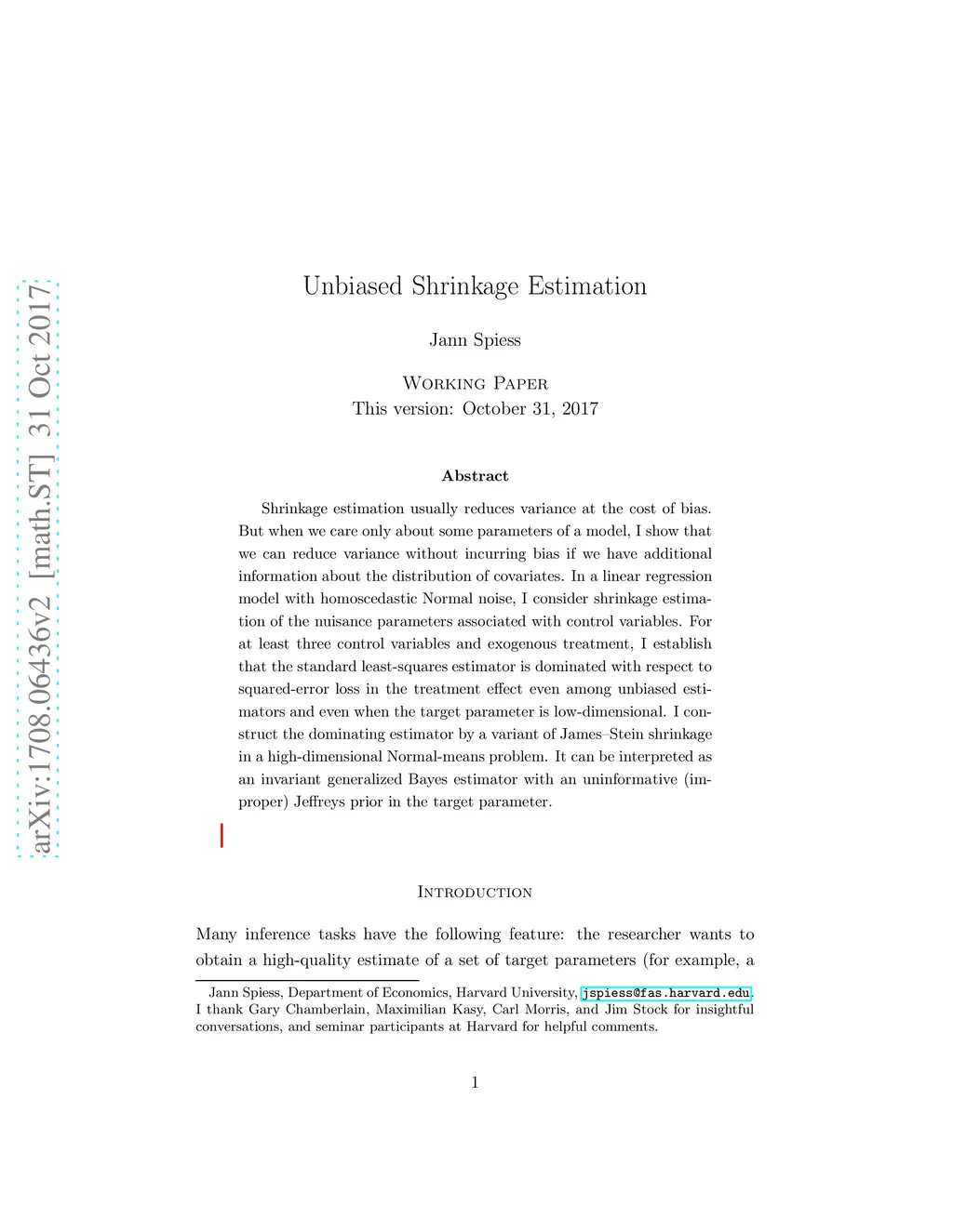 Shrinkage estimation usually reduces variance at the cost of bias. But when we care only about some parameters of a model, I show that we can reduce variance without incurring bias if we have additional information about the distribution of covariates. In a linear regression model with homoscedastic Normal noise, I consider shrinkage estimation of the nuisance parameters associated with control variables. For at least three control variables and exogenous treatment, I establish that the standard least-squares estimator is dominated with respect to squared-error loss in the treatment effect even among unbiased estimators and even when the target parameter is low-dimensional. I construct the dominating estimator by a variant of James-Stein shrinkage in a high-dimensional Normal-means problem. It can be interpreted as an invariant generalized Bayes estimator with an uninformative (improper) Jeffreys prior in the target parameter.