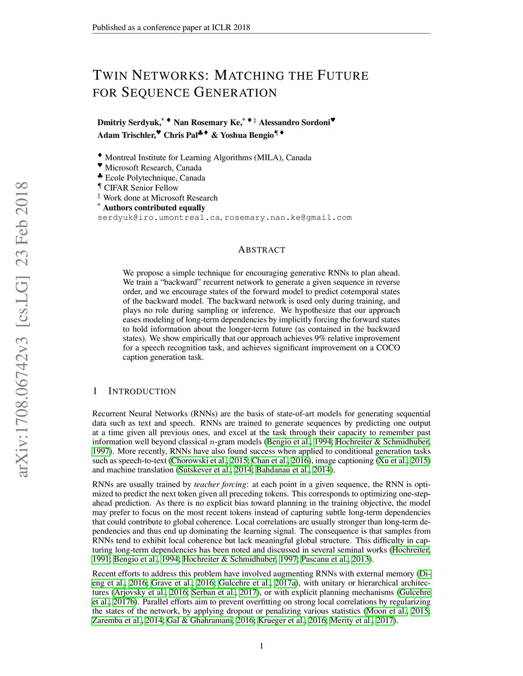 Twin Networks: Matching the Future for Sequence Generation