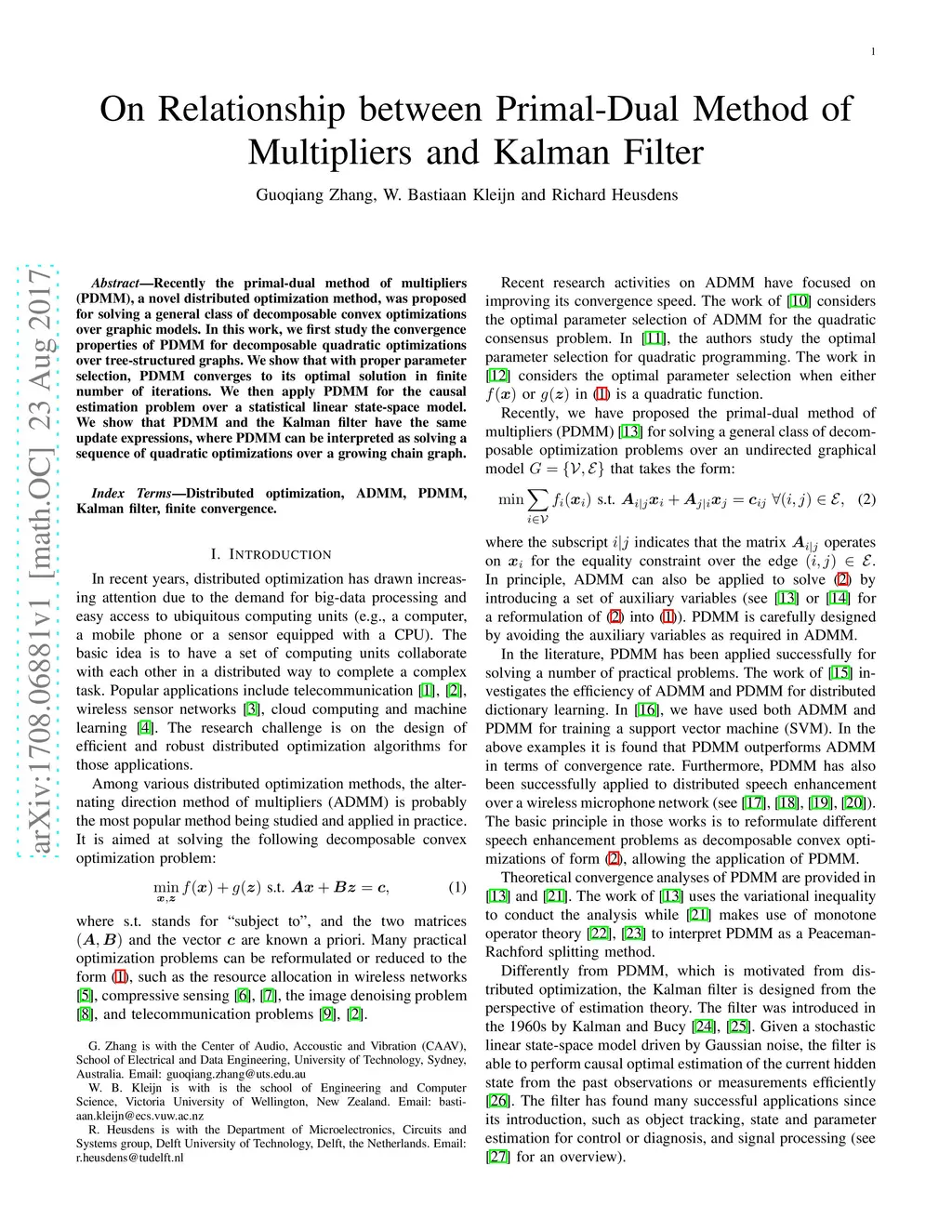 Recently the primal-dual method of multipliers (PDMM), a novel distributed optimization method, was proposed for solving a general class of decomposable convex optimizations over graphic models. In this work, we first study the convergence properties of PDMM for decomposable quadratic optimizations over tree-structured graphs. We show that with proper parameter selection, PDMM converges to its optimal solution in finite number of iterations. We then apply PDMM for the causal estimation problem over a statistical linear state-space model. We show that PDMM and the Kalman filter have the same update expressions, where PDMM can be interpreted as solving a sequence of quadratic optimizations over a growing chain graph.