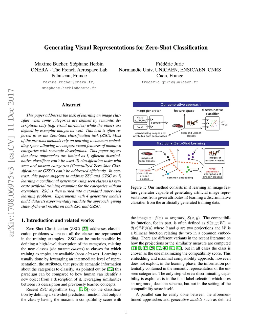 This paper addresses the task of learning an image clas-sifier when some categories are defined by semantic descriptions only (e.g. visual attributes) while the others are defined by exemplar images as well. This task is often referred to as the Zero-Shot classification task (ZSC). Most of the previous methods rely on learning a common embedding space allowing to compare visual features of unknown categories with semantic descriptions. This paper argues that these approaches are limited as i) efficient discrimi-native classifiers can't be used ii) classification tasks with seen and unseen categories (Generalized Zero-Shot Classification or GZSC) can't be addressed efficiently. In contrast , this paper suggests to address ZSC and GZSC by i) learning a conditional generator using seen classes ii) generate artificial training examples for the categories without exemplars. ZSC is then turned into a standard supervised learning problem. Experiments with 4 generative models and 5 datasets experimentally validate the approach, giving state-of-the-art results on both ZSC and GZSC.