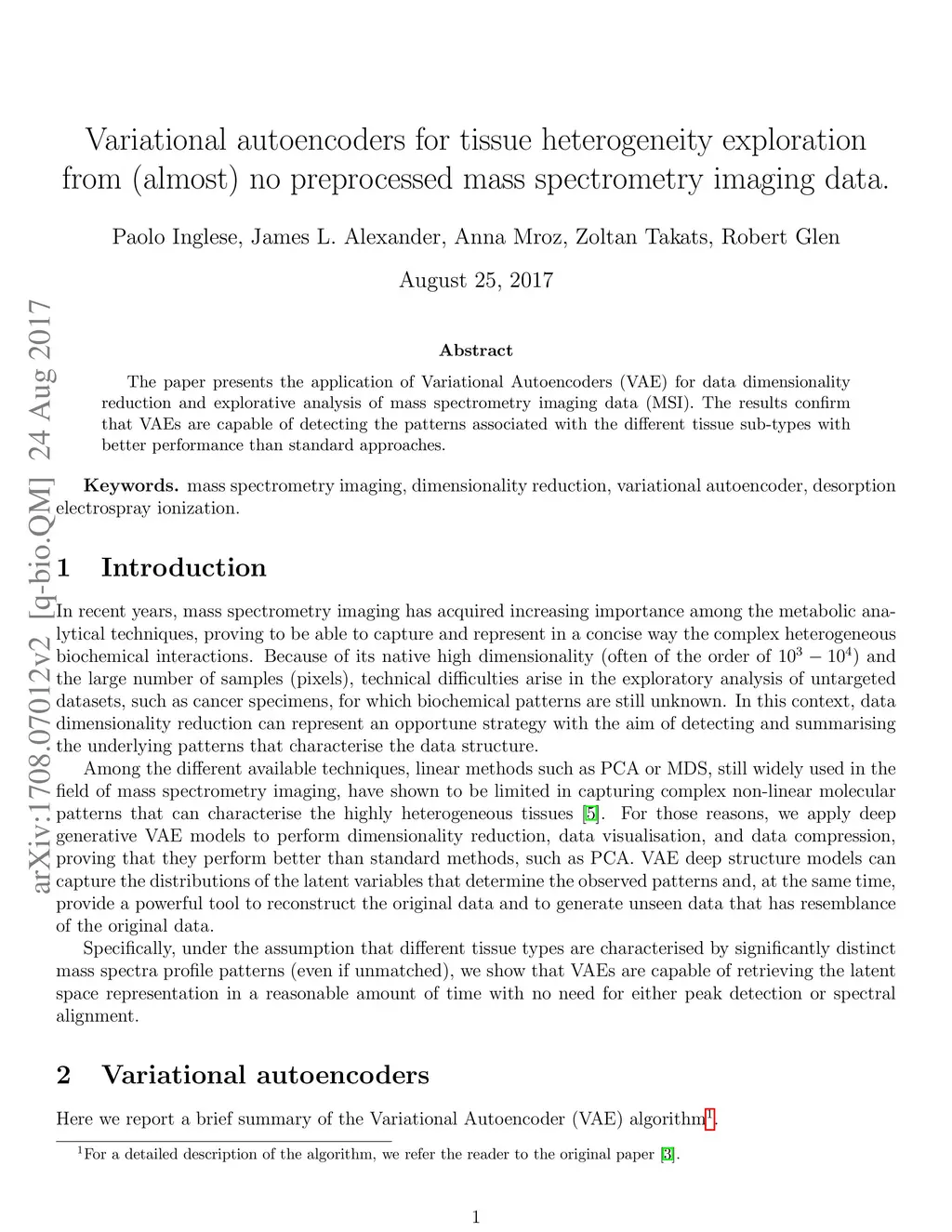 The paper presents the application of Variational Autoencoders (VAE) for data dimensionality reduction and explorative analysis of mass spectrometry imaging data (MSI). The results confirm that VAEs are capable of detecting the patterns associated with the different tissue sub-types with performance than standard approaches.
