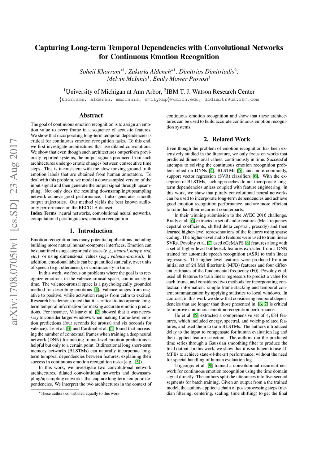 The goal of continuous emotion recognition is to assign an emotion value to every frame in a sequence of acoustic features. We show that incorporating long-term temporal dependencies is critical for continuous emotion recognition tasks. To this end, we first investigate architectures that use dilated convolutions. We show that even though such architectures outperform previously reported systems, the output signals produced from such architectures undergo erratic changes between consecutive time steps. This is inconsistent with the slow moving ground-truth emotion labels that are obtained from human annotators. To deal with this problem, we model a downsampled version of the input signal and then generate the output signal through upsampling. Not only does the resulting downsampling/upsampling network achieve good performance, it also generates smooth output trajectories. Our method yields the best known audio-only performance on the RECOLA dataset.