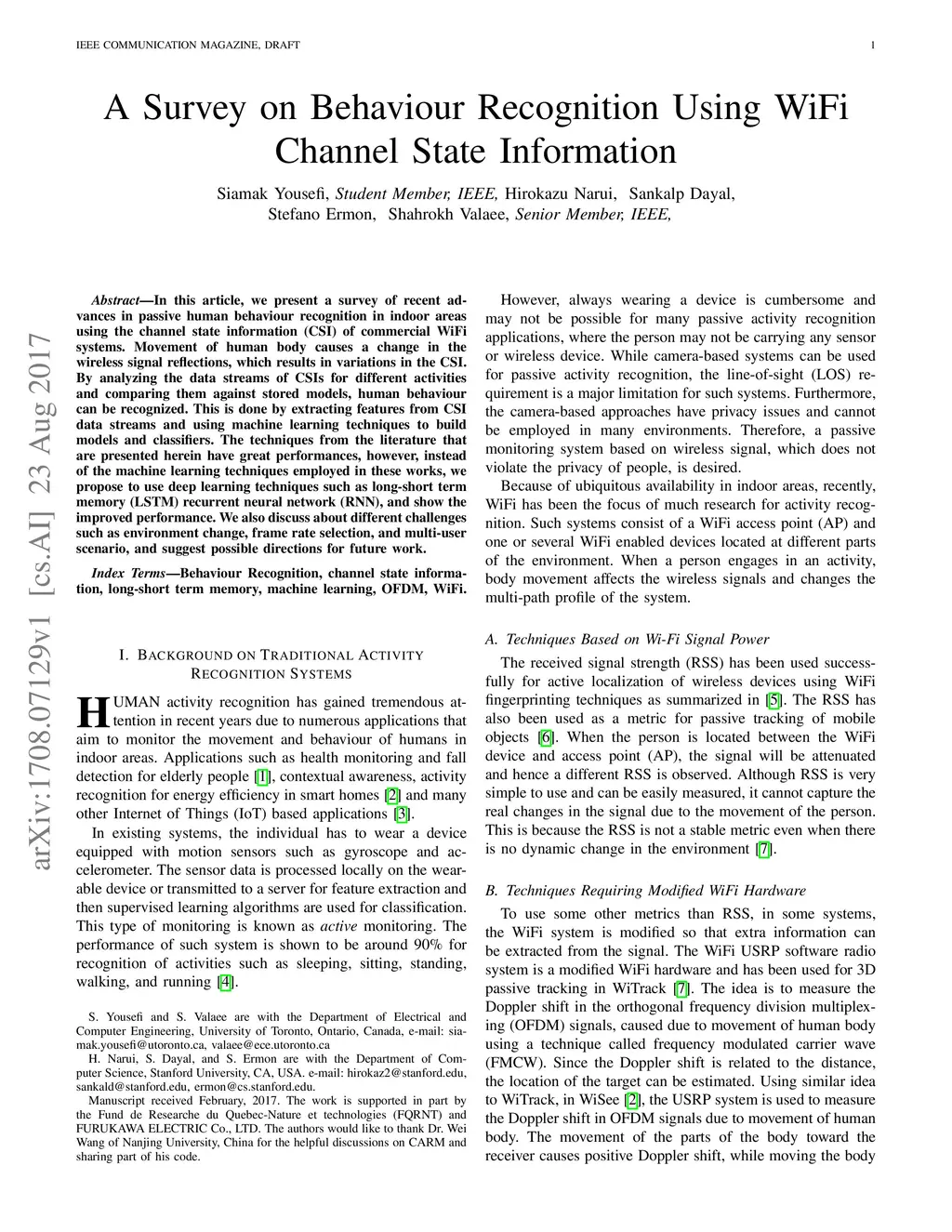 In this article, we present a survey of recent advances in passive human behaviour recognition in indoor areas using the channel state information (CSI) of commercial WiFi systems. Movement of human body causes a change in the wireless signal reflections, which results in variations in the CSI. By analyzing the data streams of CSIs for different activities and comparing them against stored models, human behaviour can be recognized. This is done by extracting features from CSI data streams and using machine learning techniques to build models and classifiers. The techniques from the literature that are presented herein have great performances, however, instead of the machine learning techniques employed in these works, we propose to use deep learning techniques such as long-short term memory (LSTM) recurrent neural network (RNN), and show the improved performance. We also discuss about different challenges such as environment change, frame rate selection, and multi-user scenario, and suggest possible directions for future work.