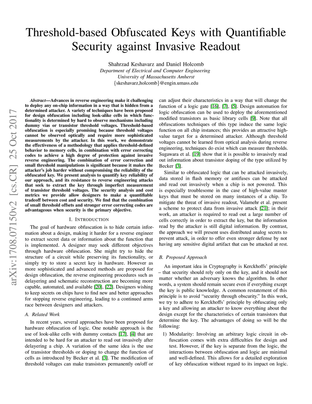 Advances in reverse engineering make it challenging to deploy any on-chip information in a way that is hidden from a determined attacker. A variety of techniques have been proposed for design obfuscation including look-alike cells in which functionality is determined by hard to observe mechanisms including dummy vias or transistor threshold voltages. Threshold-based obfuscation is especially promising because threshold voltages cannot be observed optically and require more sophisticated measurements by the attacker. In this work, we demonstrate the effectiveness of a methodology that applies threshold-defined behavior to memory cells, in combination with error correcting codes to achieve a high degree of protection against invasive reverse engineering. The combination of error correction and small threshold manipulations is significant because it makes the attacker's job harder without compromising the reliability of the obfuscated key. We present analysis to quantify key reliability of our approach, and its resistance to reverse engineering attacks that seek to extract the key through imperfect measurement of transistor threshold voltages. The security analysis and cost metrics we provide allow designers to make a quantifiable tradeoff between cost and security. We find that the combination of small threshold offsets and stronger error correcting codes are advantageous when security is the primary objective.
