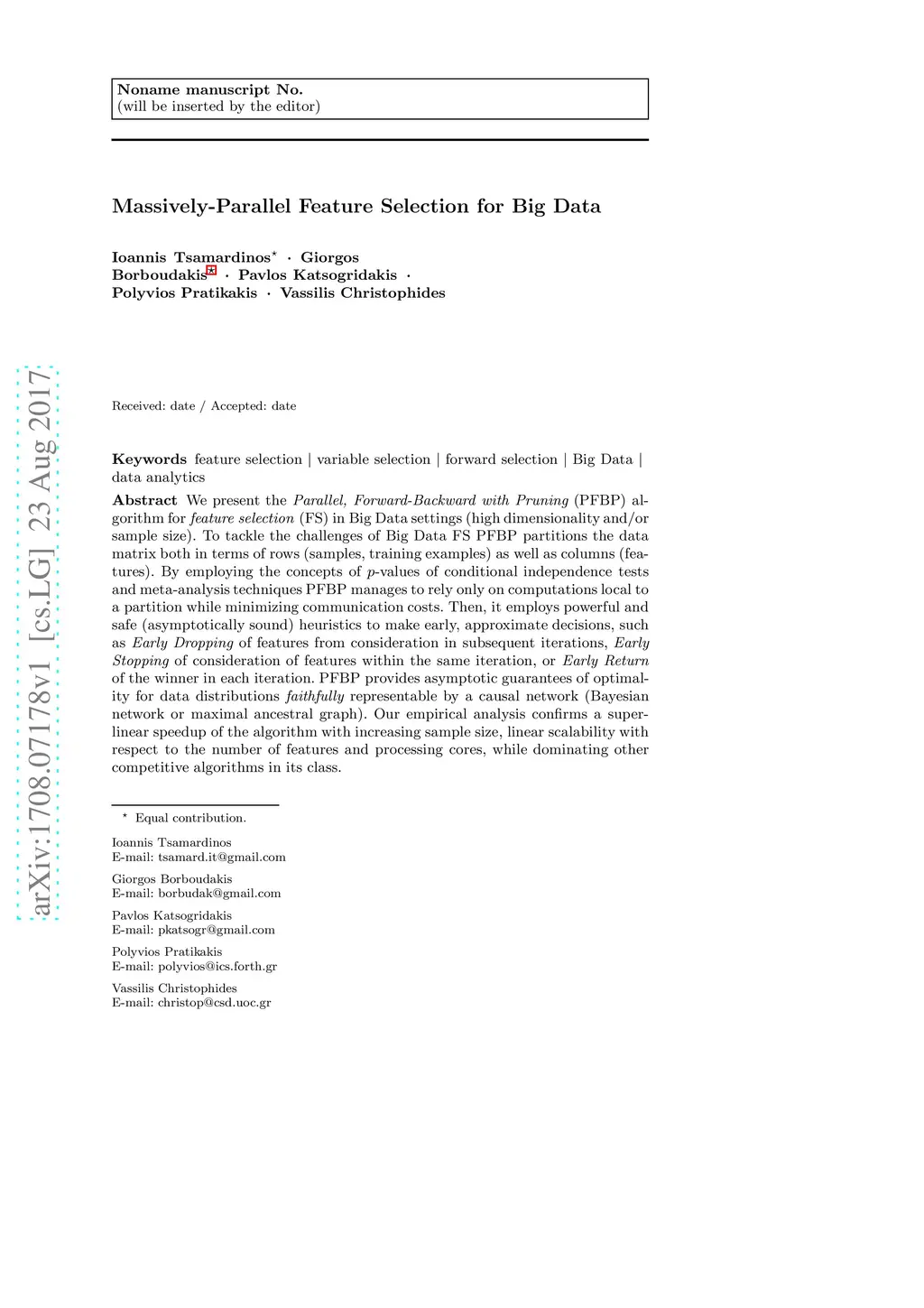 We present the Parallel, Forward-Backward with Pruning (PFBP) algorithm for feature selection (FS) in Big Data settings (high dimensionality and/or sample size). To tackle the challenges of Big Data FS PFBP partitions the data matrix both in terms of rows (samples, training examples) as well as columns (features). By employing the concepts of -values of conditional independence tests and meta-analysis techniques PFBP manages to rely only on computations local to a partition while minimizing communication costs. Then, it employs powerful and safe (asymptotically sound) heuristics to make early, approximate decisions, such as Early Dropping of features from consideration in subsequent iterations, Early Stopping of consideration of features within the same iteration, or Early Return of the winner in each iteration. PFBP provides asymptotic guarantees of optimality for data distributions faithfully representable by a causal network (Bayesian network or maximal ancestral graph). Our empirical analysis confirms a super-linear speedup of the algorithm with increasing sample size, linear scalability with respect to the number of features and processing cores, while dominating other competitive algorithms in its class.