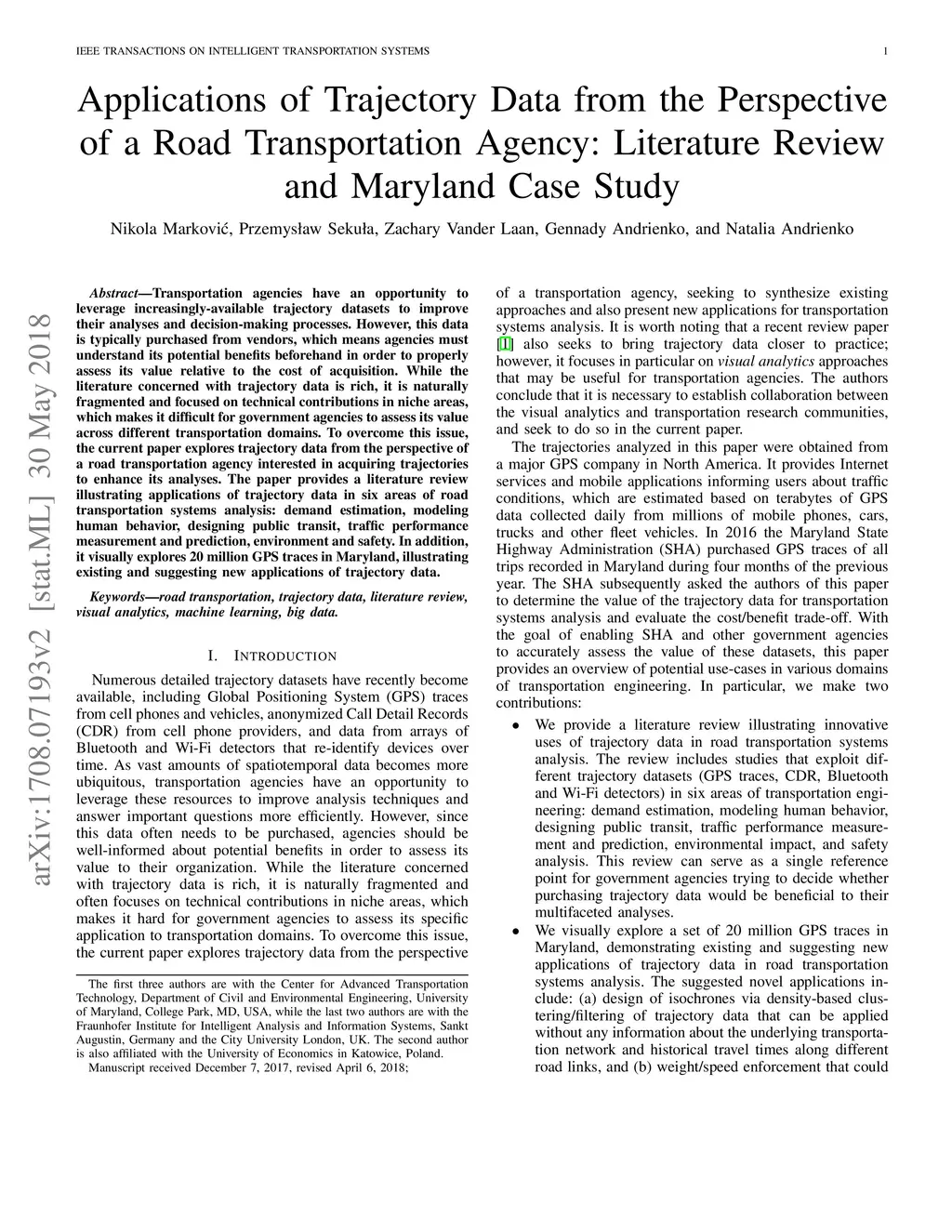 Transportation agencies have an opportunity to leverage increasingly-available trajectory datasets to improve their analyses and decision-making processes. However, this data is typically purchased from vendors, which means agencies must understand its potential benefits beforehand in order to properly assess its value relative to the cost of acquisition. While the literature concerned with trajectory data is rich, it is naturally fragmented and focused on technical contributions in niche areas, which makes it difficult for government agencies to assess its value across different transportation domains. To overcome this issue, the current paper explores trajectory data from the perspective of a road transportation agency interested in acquiring trajectories to enhance its analyses. The paper provides a literature review illustrating applications of trajectory data in six areas of road transportation systems analysis: demand estimation, modeling human behavior, designing public transit, traffic performance measurement and prediction, environment and safety. In addition, it visually explores 20 million GPS traces in Maryland, illustrating existing and suggesting new applications of trajectory data.