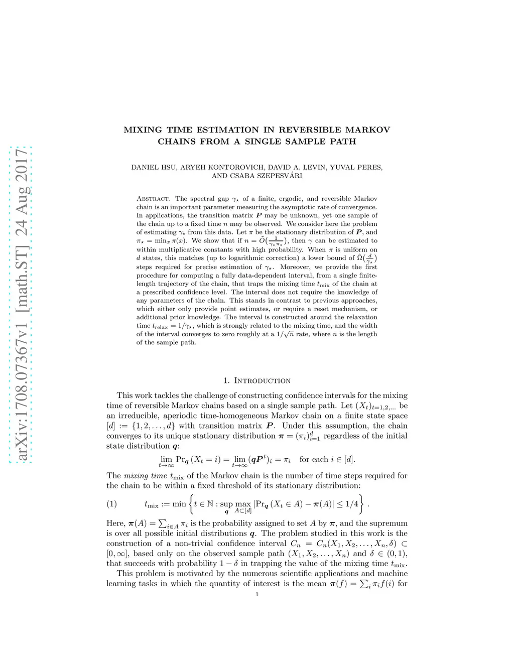 The spectral gap of a finite, ergodic, and reversible Markov chain is an important parameter measuring the asymptotic rate of convergence. In applications, the transition matrix may be unknown, yet one sample of the chain up to a fixed time may be observed. We consider here the problem of estimating from this data. Let be the stationary distribution of , and . We show that if , then can be estimated to within multiplicative constants with high probability. When is uniform on states, this matches (up to logarithmic correction) a lower bound of steps required for precise estimation of . Moreover, we provide the first procedure for computing a fully data-dependent interval, from a single finite-length trajectory of the chain, that traps the mixing time of the chain at a prescribed confidence level. The interval does not require the knowledge of any parameters of the chain. This stands in contrast to previous approaches, which either only provide point estimates, or require a reset mechanism, or additional prior knowledge. The interval is constructed around the relaxation time , which is strongly related to the mixing time, and the width of the interval converges to zero roughly at a rate, where is the length of the sample path.
