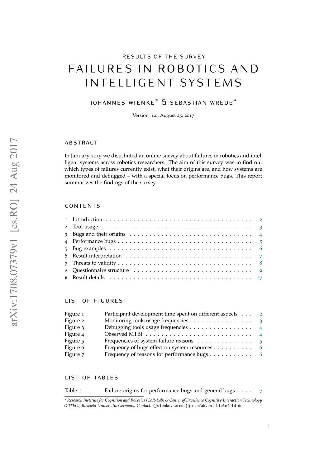 In January 2015 we distributed an online survey about failures in robotics and intelligent systems across robotics researchers. The aim of this survey was to find out which types of failures currently exist, what their origins are, and how systems are monitored and debugged - with a special focus on performance bugs. This report summarizes the findings of the survey.