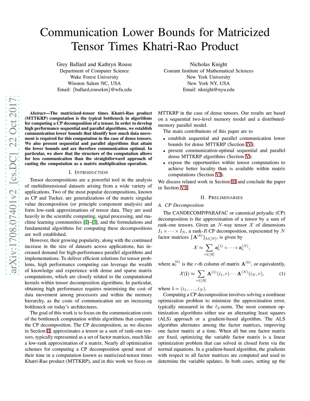 The matricized-tensor times Khatri-Rao product computation is the typical bottleneck in algorithms for computing a CP decomposition of a tensor. In order to develop high performance sequential and parallel algorithms, we establish communication lower bounds that identify how much data movement is required for this computation in the case of dense tensors. We also present sequential and parallel algorithms that attain the lower bounds and are therefore communication optimal. In particular, we show that the structure of the computation allows for less communication than the straightforward approach of casting the computation as a matrix multiplication operation.