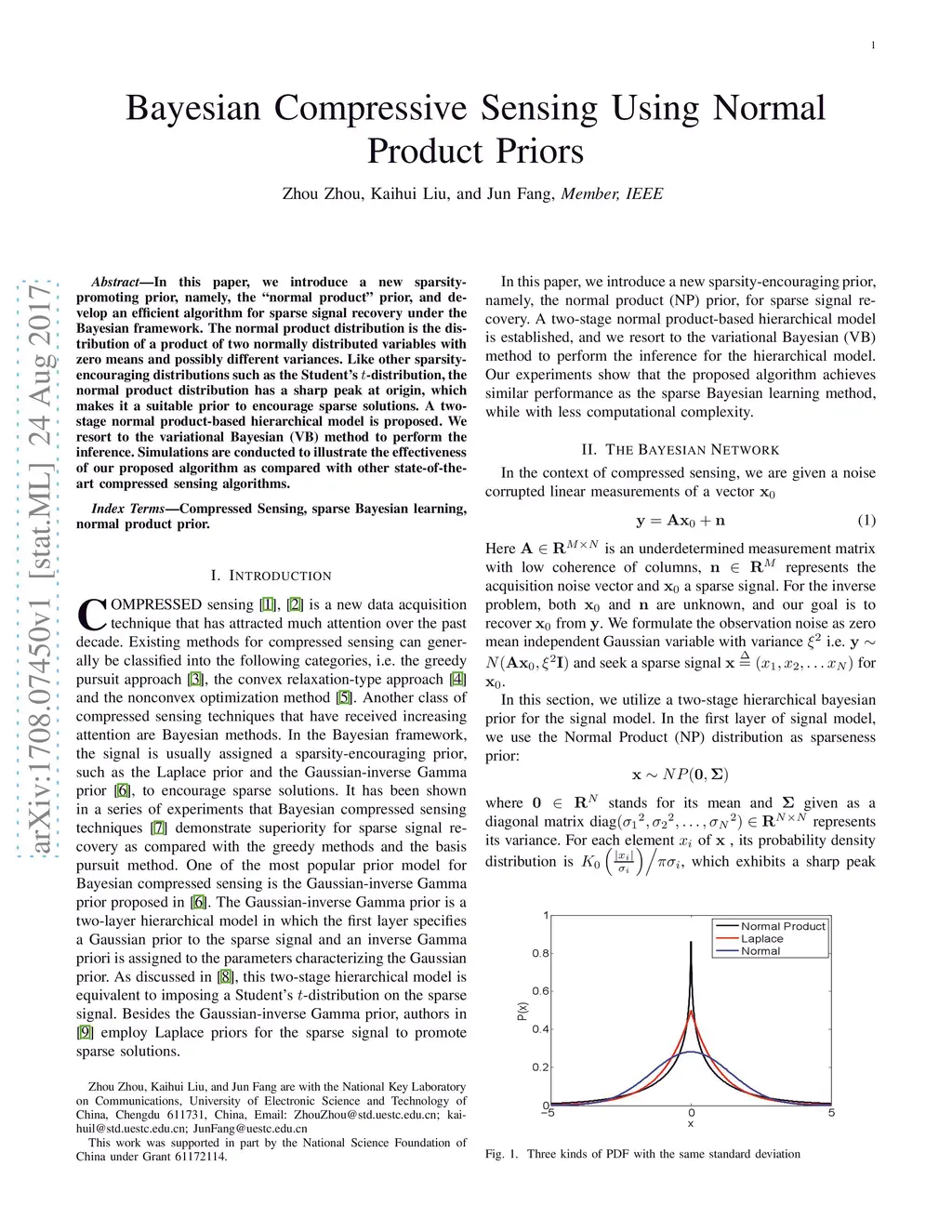 In this paper, we introduce a new sparsity-promoting prior, namely, the "normal product" prior, and develop an efficient algorithm for sparse signal recovery under the Bayesian framework. The normal product distribution is the distribution of a product of two normally distributed variables with zero means and possibly different variances. Like other sparsity-encouraging distributions such as the Student's -distribution, the normal product distribution has a sharp peak at origin, which makes it a suitable prior to encourage sparse solutions. A two-stage normal product-based hierarchical model is proposed. We resort to the variational Bayesian (VB) method to perform the inference. Simulations are conducted to illustrate the effectiveness of our proposed algorithm as compared with other state-of-the-art compressed sensing algorithms.