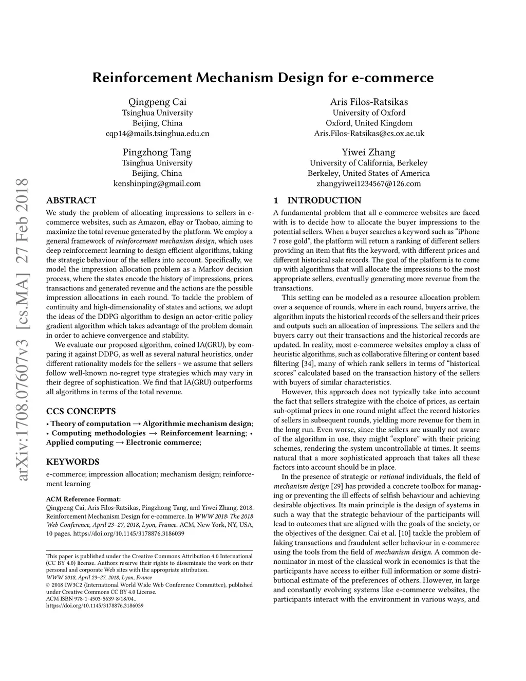 We study the problem of allocating impressions to sellers in e-commerce websites, such as Amazon, eBay or Taobao, aiming to maximize the total revenue generated by the platform. We employ a general framework of reinforcement mechanism design, which uses deep reinforcement learning to design efficient algorithms, taking the strategic behaviour of the sellers into account. Specifically, we model the impression allocation problem as a Markov decision process, where the states encode the history of impressions, prices, transactions and generated revenue and the actions are the possible impression allocations in each round. To tackle the problem of continuity and high-dimensionality of states and actions, we adopt the ideas of the DDPG algorithm to design an actor-critic policy gradient algorithm which takes advantage of the problem domain in order to achieve convergence and stability. We evaluate our proposed algorithm, coined IA(GRU), by comparing it against DDPG, as well as several natural heuristics, under different rationality models for the sellers - we assume that sellers follow well-known no-regret type strategies which may vary in their degree of sophistication. We find that IA(GRU) outperforms all algorithms in terms of the total revenue.