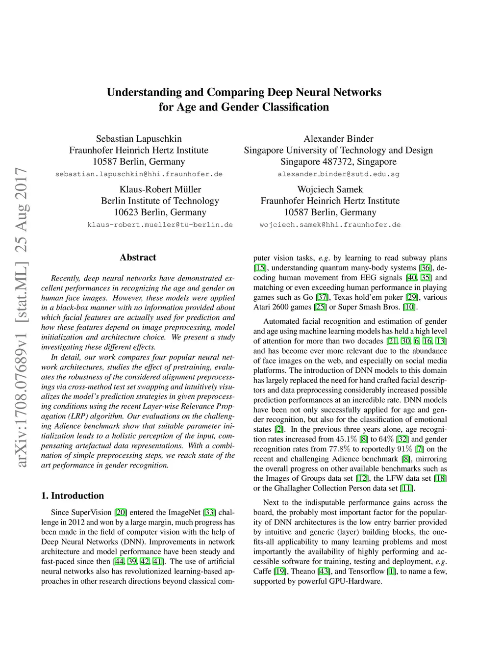 Recently, deep neural networks have demonstrated excellent performances in recognizing the age and gender on human face images. However, these models were applied in a black-box manner with no information provided about which facial features are actually used for prediction and how these features depend on image preprocessing, model initialization and architecture choice. We present a study investigating these different effects. In detail, our work compares four popular neural network architectures, studies the effect of pretraining, evaluates the robustness of the considered alignment preprocessings via cross-method test set swapping and intuitively visualizes the model's prediction strategies in given preprocessing conditions using the recent Layer-wise Relevance Propagation (LRP) algorithm. Our evaluations on the challenging Adience benchmark show that suitable parameter initialization leads to a holistic perception of the input, compensating artefactual data representations. With a combination of simple preprocessing steps, we reach state of the art performance in gender recognition.