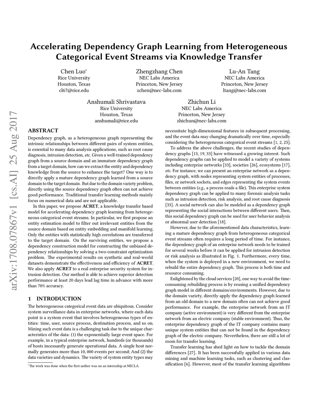 Dependency graph, as a heterogeneous graph representing the intrinsic relationships between different pairs of system entities, is essential to many data analysis applications, such as root cause diagnosis, intrusion detection, etc. Given a well-trained dependency graph from a source domain and an immature dependency graph from a target domain, how can we extract the entity and dependency knowledge from the source to enhance the target? One way is to directly apply a mature dependency graph learned from a source domain to the target domain. But due to the domain variety problem, directly using the source dependency graph often can not achieve good performance. Traditional transfer learning methods mainly focus on numerical data and are not applicable. In this paper, we propose ACRET, a knowledge transfer based model for accelerating dependency graph learning from heterogeneous categorical event streams. In particular, we first propose an entity estimation model to filter out irrelevant entities from the source domain based on entity embedding and manifold learning. Only the entities with statistically high correlations are transferred to the target domain. On the surviving entities, we propose a dependency construction model for constructing the unbiased dependency relationships by solving a two-constraint optimization problem. The experimental results on synthetic and real-world datasets demonstrate the effectiveness and efficiency of ACRET. We also apply ACRET to a real enterprise security system for intrusion detection. Our method is able to achieve superior detection performance at least 20 days lead lag time in advance with more than 70% accuracy.