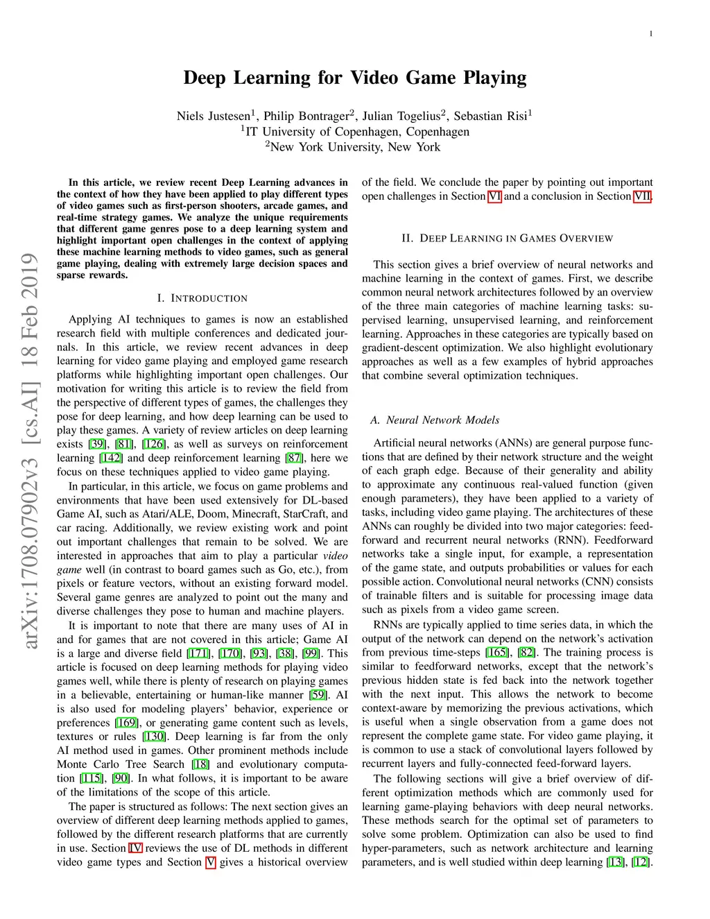 In this article, we review recent Deep Learning advances in the context of how they have been applied to play different types of video games such as first-person shooters, arcade games, and real-time strategy games. We analyze the unique requirements that different game genres pose to a deep learning system and highlight important open challenges in the context of applying these machine learning methods to video games, such as general game playing, dealing with extremely large decision spaces and sparse rewards.
